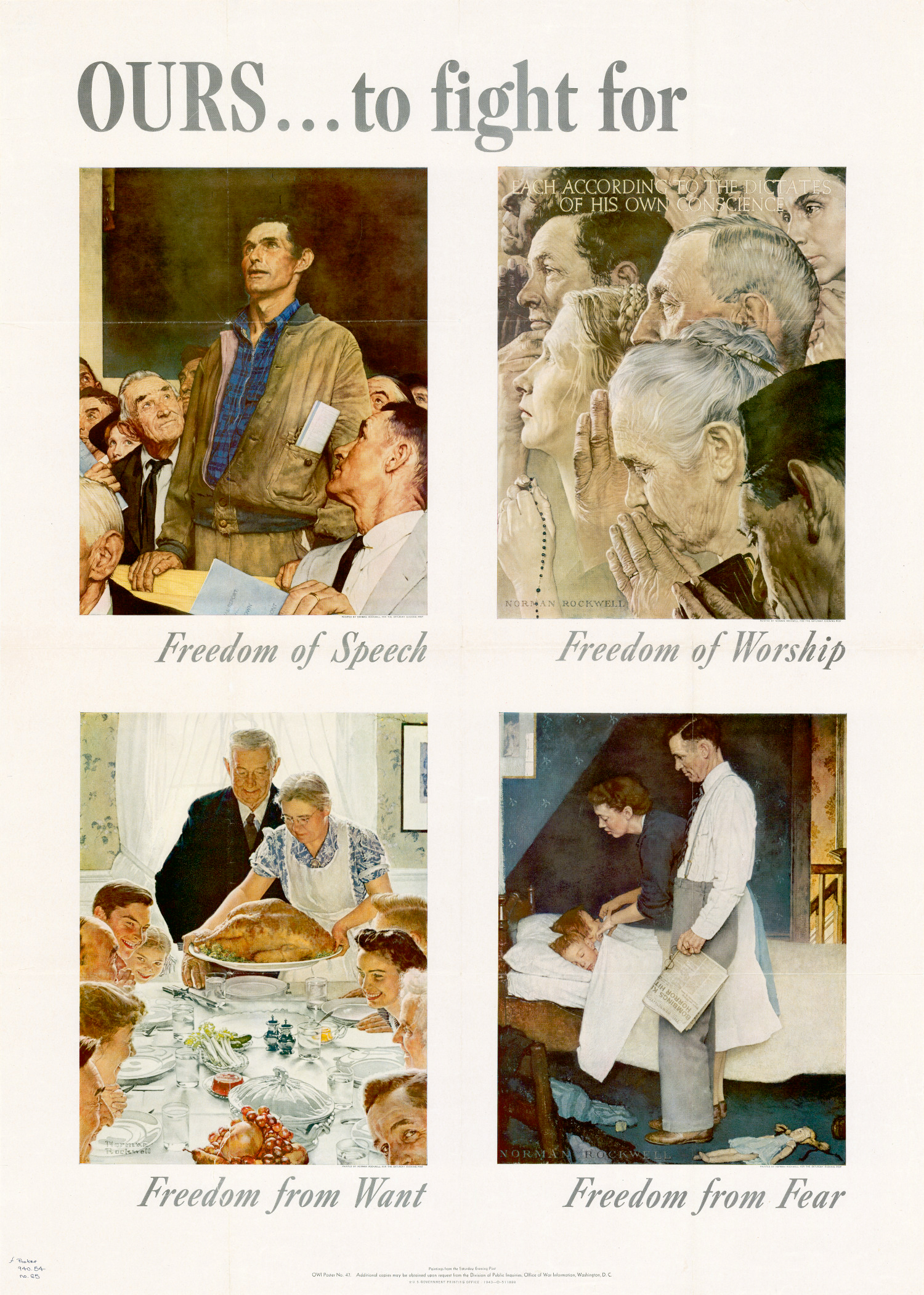 "Ours to Fight For — Freedom of Speech, Freedom of Worship, Freedom from Want, Freedom from Fear" Poster illustrated by four paintings by Norman Rockwell for The Saturday Evening Post magazine's "Four Freedoms" series. Poster, color, 102 x 73 cm., published by the United States Government Printing Office. |