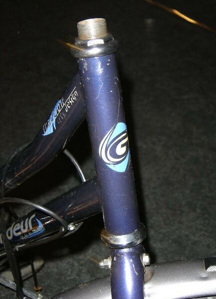 | Description | bicycle part, a photo showing the front of a bicycle frame, with handlebars and headset lock nut removed, displaying the installation of a threaded headset. |