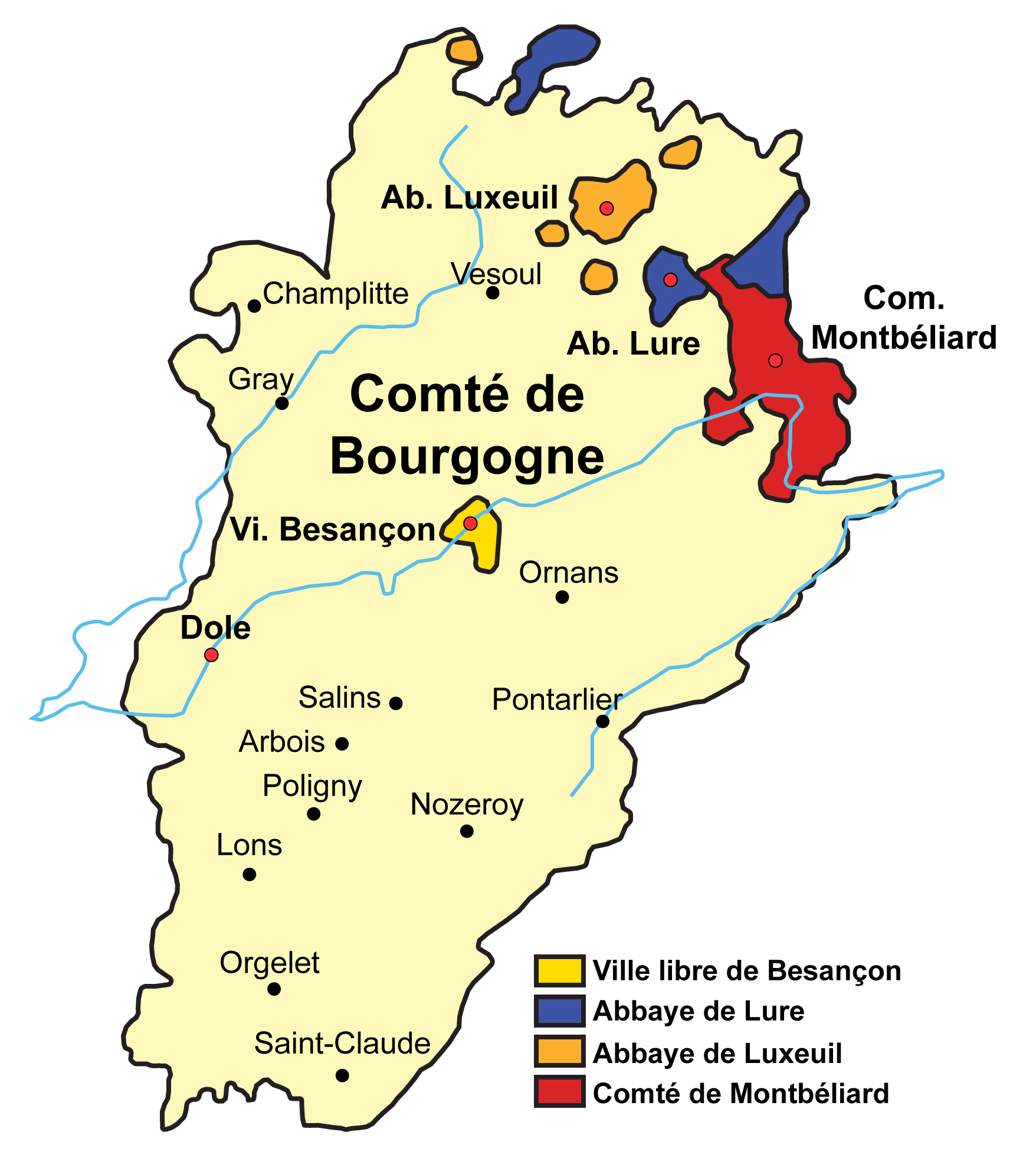 English: Franche-Comté (without Belfort) after the treaty of Senlis (1493). The cultural entity was divided into several states including the county of Burgundy (direct ancestor of Franche-Comté), the imperial free city of Besançon, the abbeys of Lure and Luxeuil and the county of Montbéliard. |