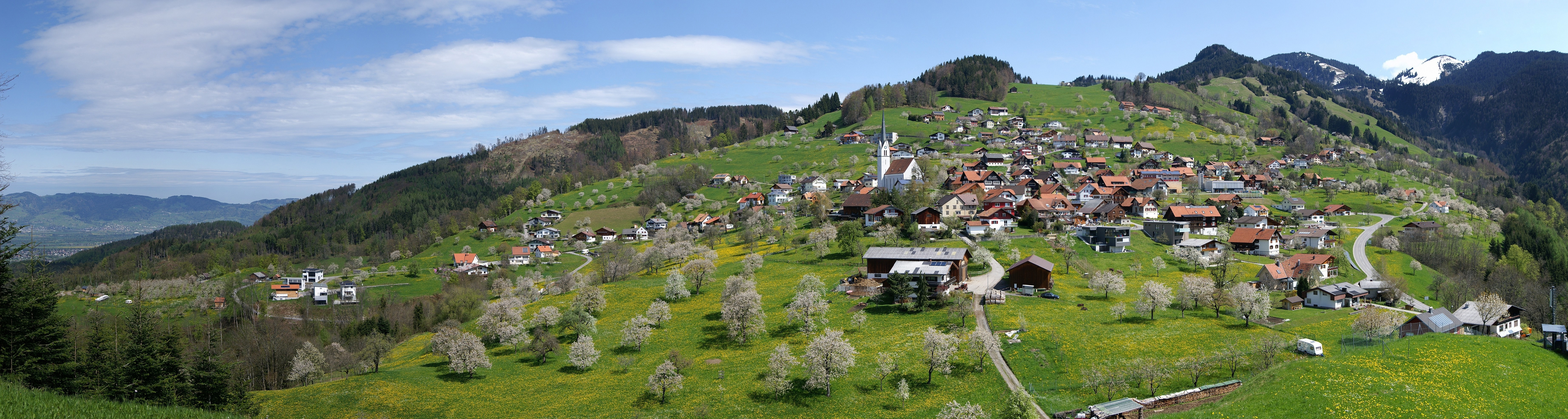 English: A view over blooming cherry trees towards the centre of the austrian village Fraxern in Vorarlberg. Pano with 11 Pics. |