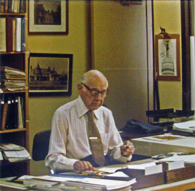 English: Portrait of Frederick A. Muhlenberg sitting at his desk at Muhlenberg Greene Architects |