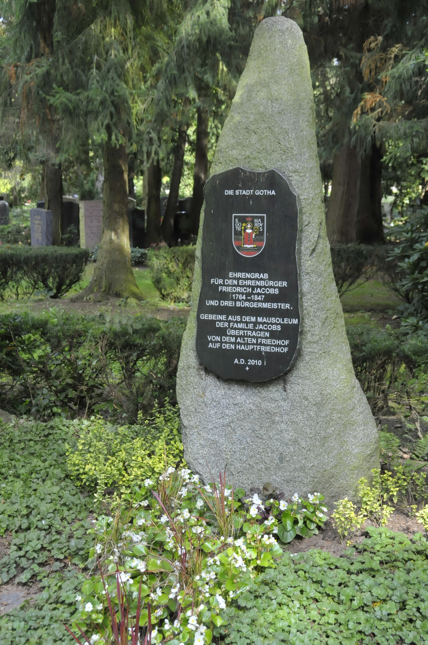 DIE STADT GOTHA EHRENGRAB FÜR DEN EHRENBÜRGER FRIEDRICH JACOBS 1764-1847 UND DREI BÜRGERMEISTER. GEBEINE AUS DEM MAUSOLEUM DER FAMILIE JACOBS ÜBERTRAGEN VON DEM ALTEN FRIEDHOF AUF DEN HAUPTFRIEDHOF A. D. 2010 + |