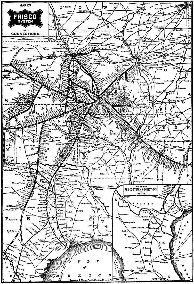 | 2011-04-06 01:00:31 | 800× 1170× | Textorus | System map of the Frisco lines (St. Louis-San Francisco Railway), probably published by the railroad itself. No date or copyright notice given, but must have been made between 1901 when Frisco acquired the [[Fort Worth and Rio Grande Railway]] between Ft |
