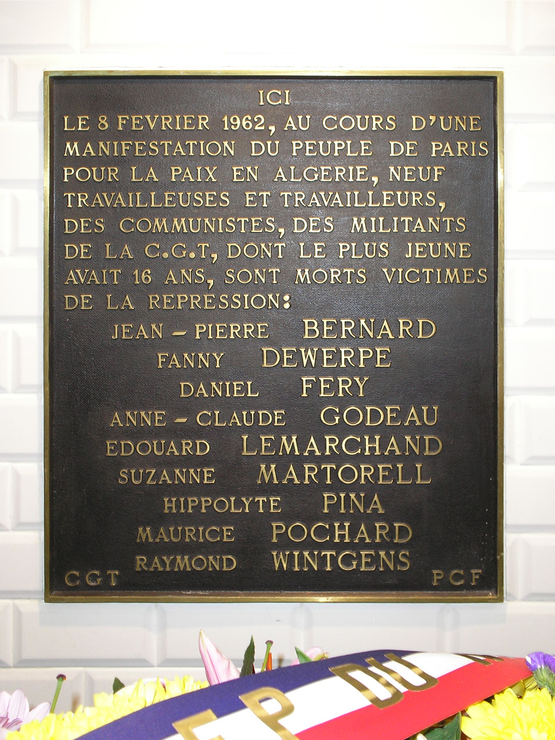 Français : Plaque commémorative du massacre du 8 février 1962 au métro Charonne à Paris. |