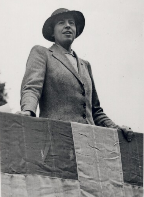 English: Photograph of the Danish resistance organizer and internalional official Gabriele Rohde (1904-1946) speaking in Netherhall Gardens, London, in 1943 |