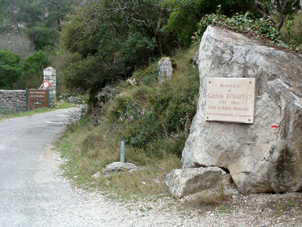 Français : Plaque à la mémoire de Gaston Rébuffat sur la route d'accès à la maison forestière de la Gardiole, à l'est du massif de Puget (Marseille, Bouches-du-Rhône)