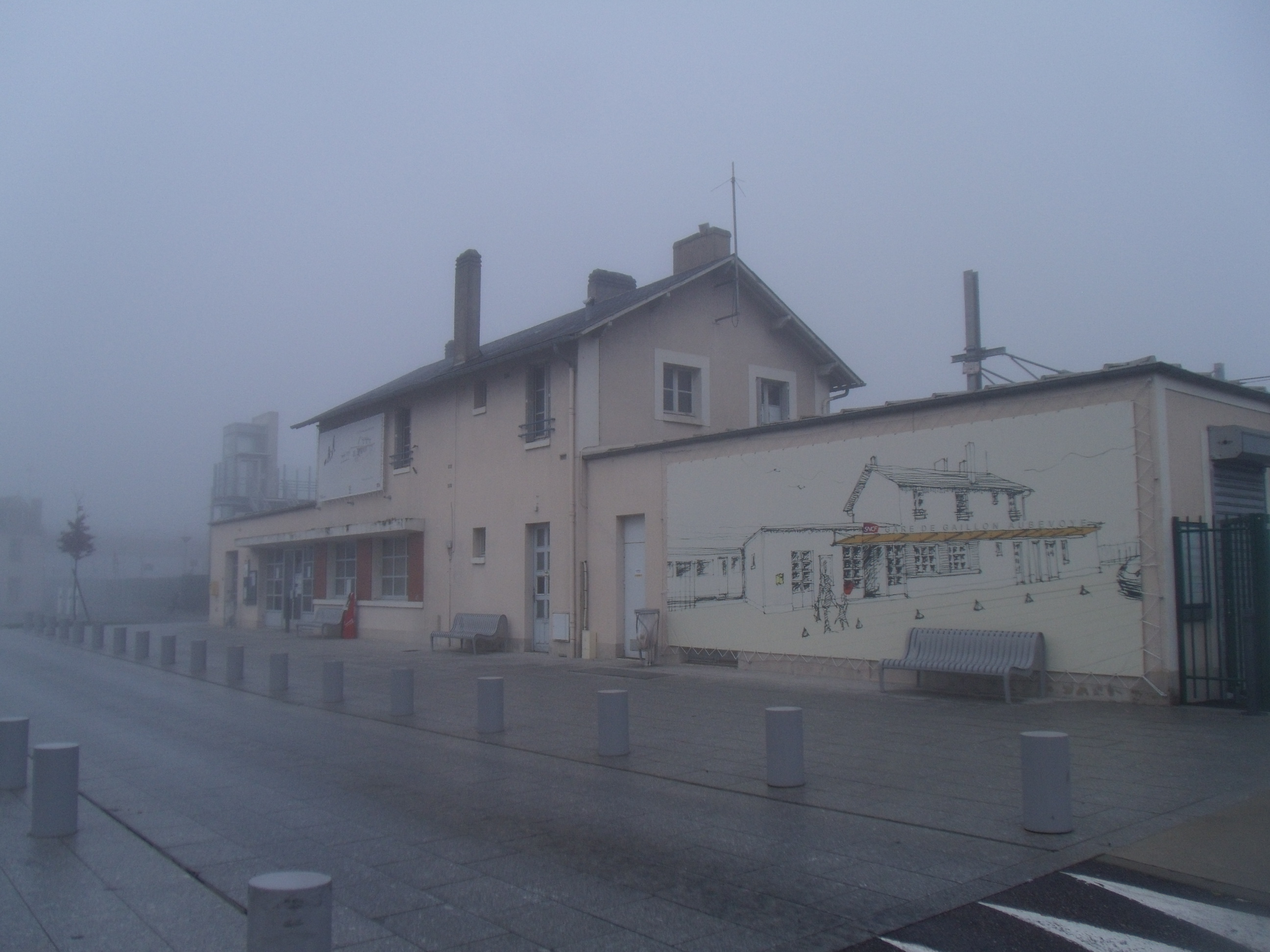 Français : La gare vue du parking ....dans le brouillard |