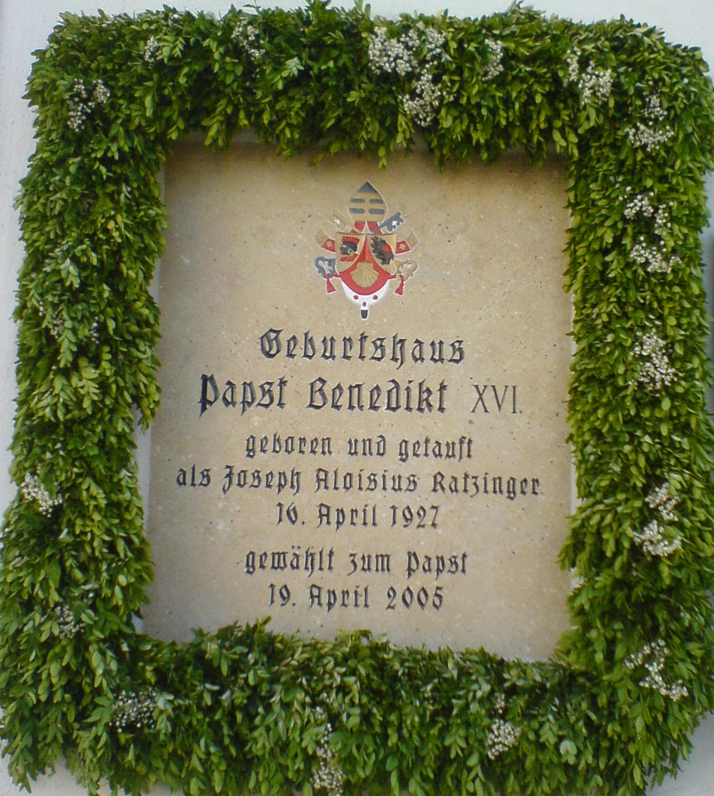 English: Marktl am Inn (South-East Bavaria), new inscription at the house where pope Benedict XVI. was born in 1927 |