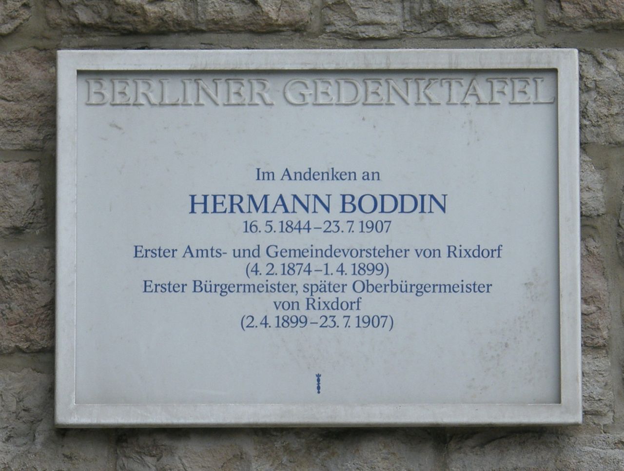 | Description | Berliner Gedenktafel für Hermann Boddin. Rathaus Neukölln, Karl-Marx-Straße 83, Berlin-Neukölln. Enthüllt am 16. Mai 1990 | |