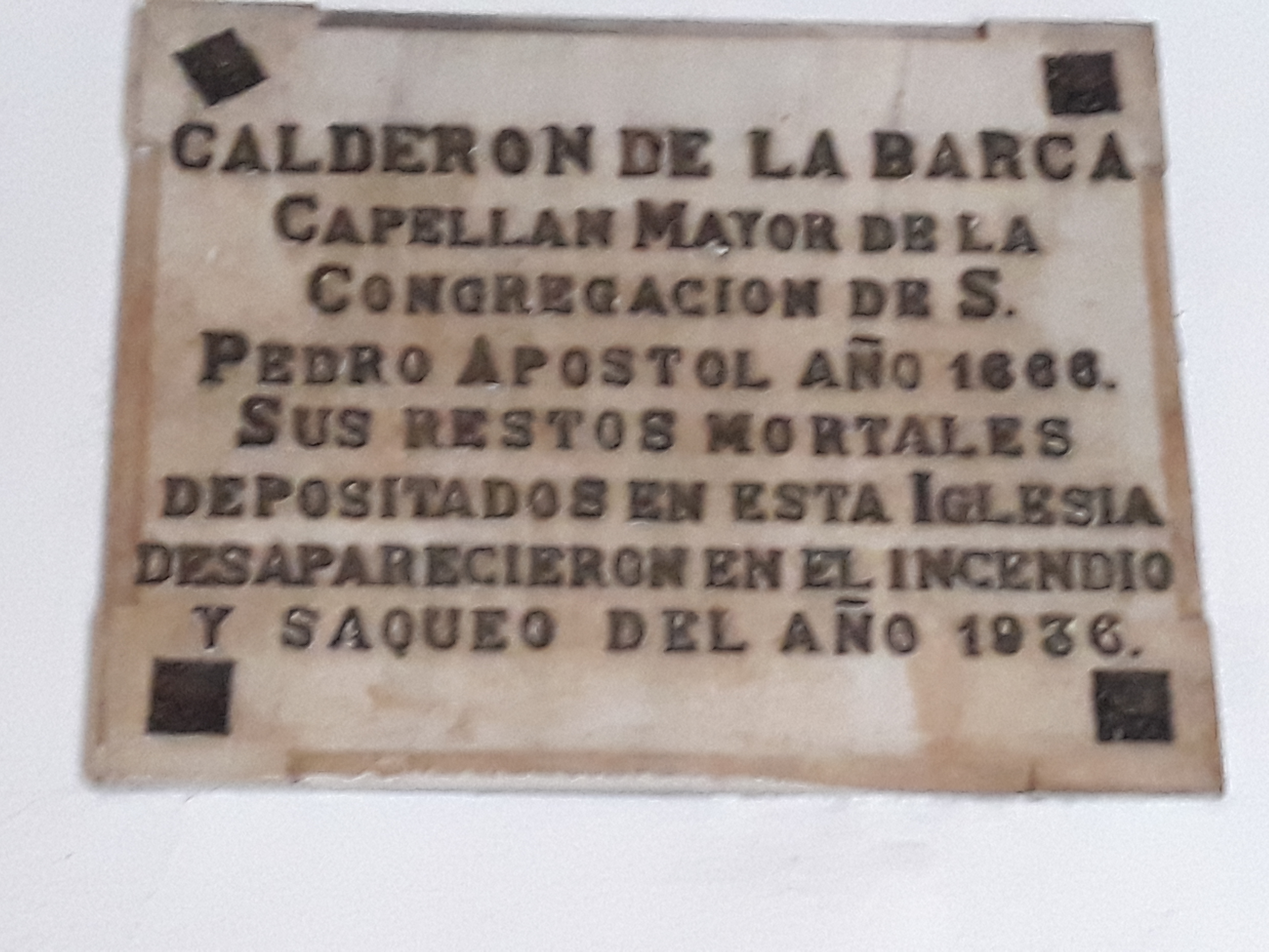 Deutsch: Gedenktafel für das Grab des spanischen Dramatikers Pedro Calderon de la Barca in der Kirche Nuestra Senora de los Dolores (Calle San Bernardo) in Madrid. |