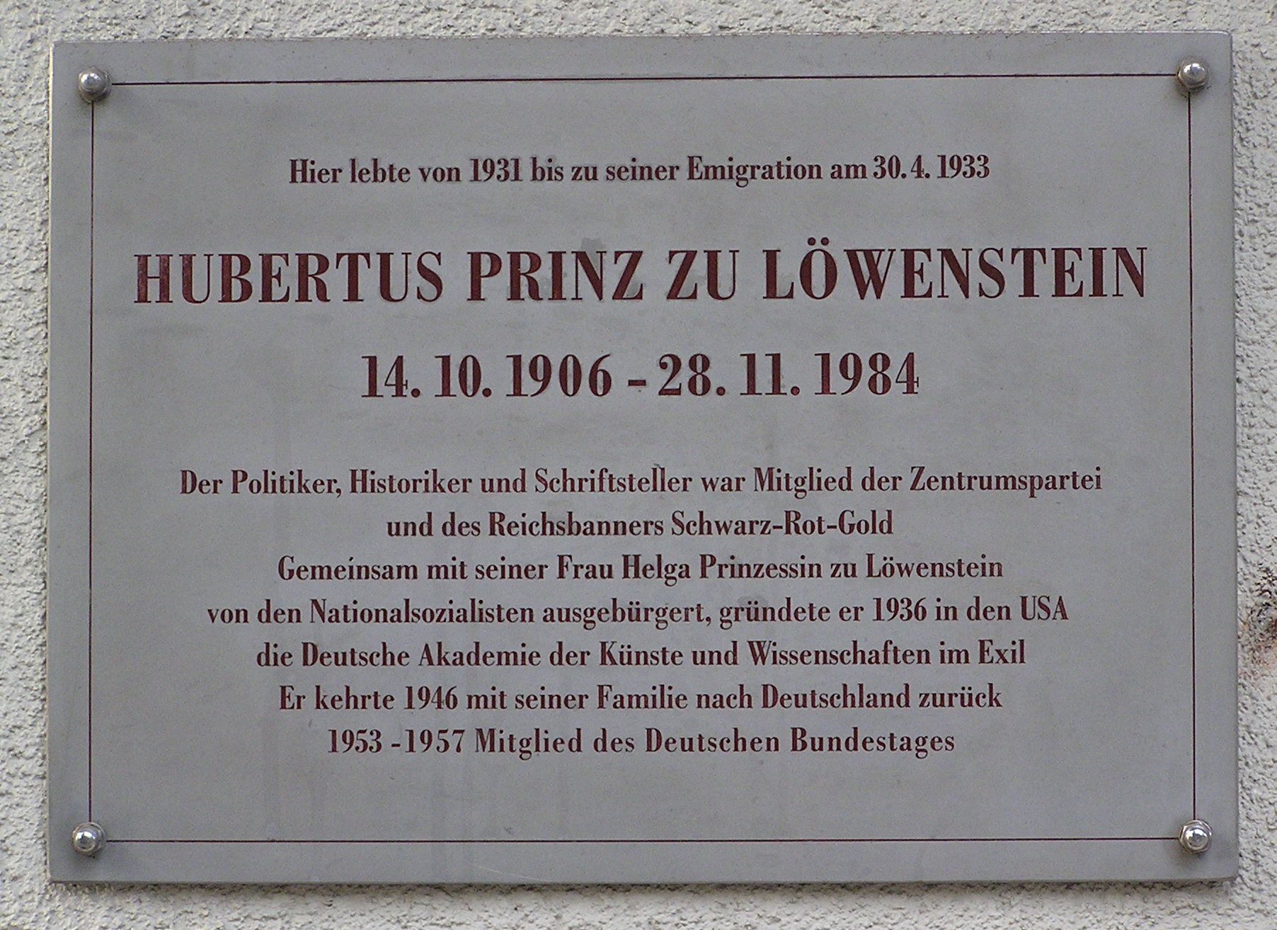 ملف:Gedenktafel Hubertus Prinz zu Loewenstein.jpg