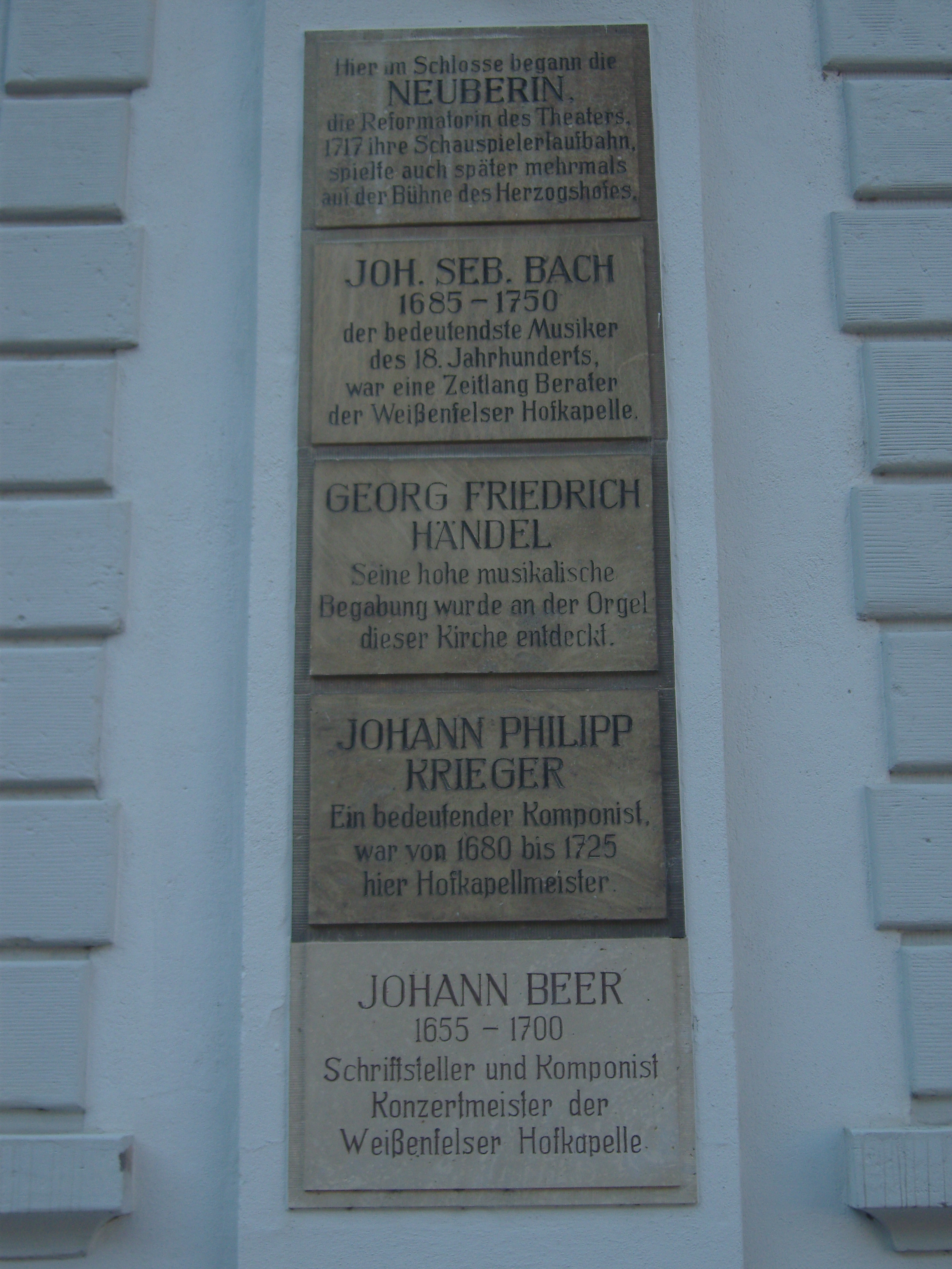 Deutsch: Gedenktafeln am Schloss Neu-Augustusburg in Weißenfels für die Neuberin, Johann Sebastian Bach, Georg Friedrich Händel, Johann Philipp Krieger und Johann Beer |