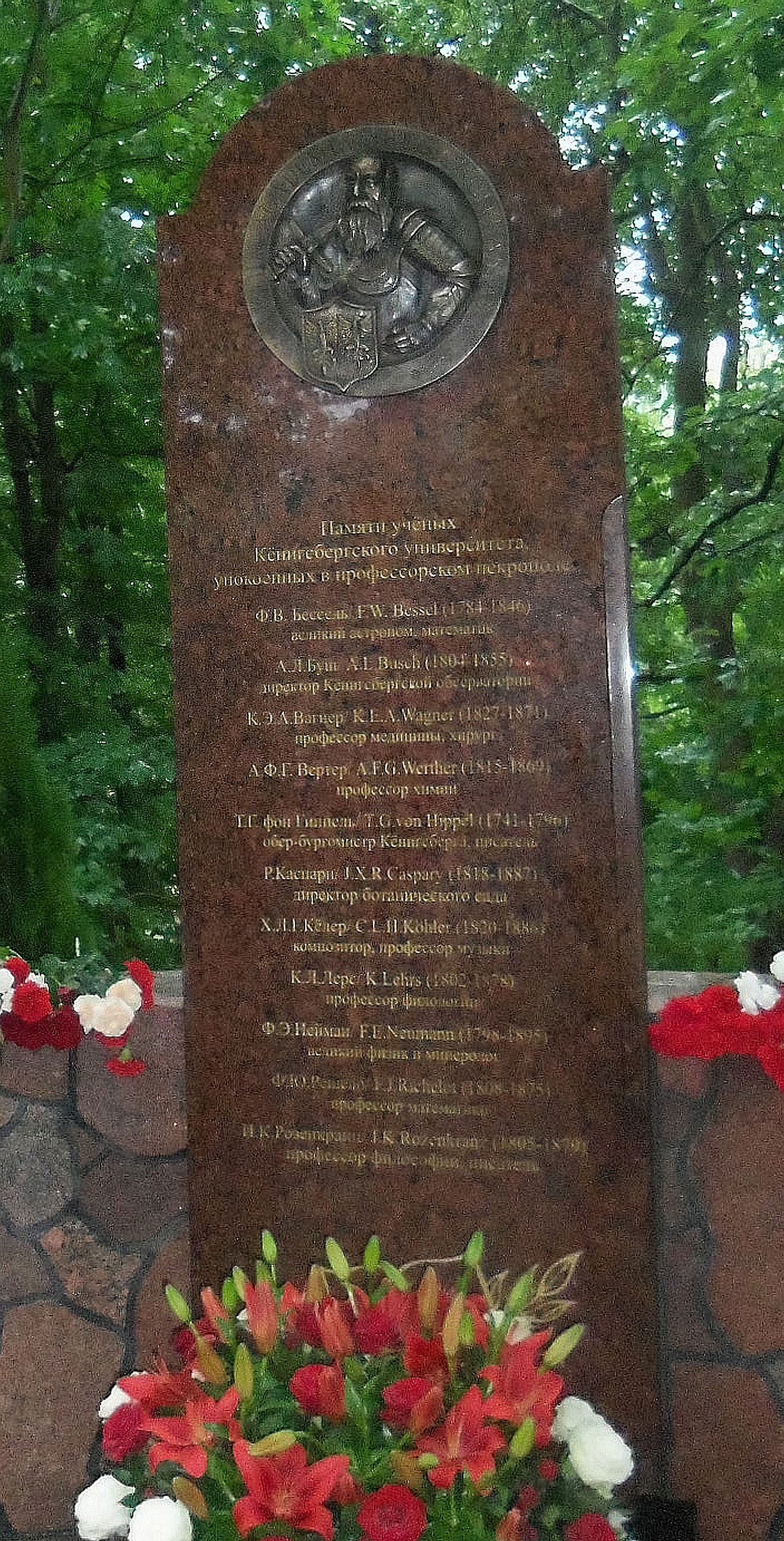 Deutsch: Dieser Gedenkstein wurde von der Stadt Kaliningrad 2014 auf dem ehemaligen "Gelehrtenfriedhof Königsberg" errichtet zum Andenken an die dort beerdigten Gelehrten der Albertus-Universität Königsberg |