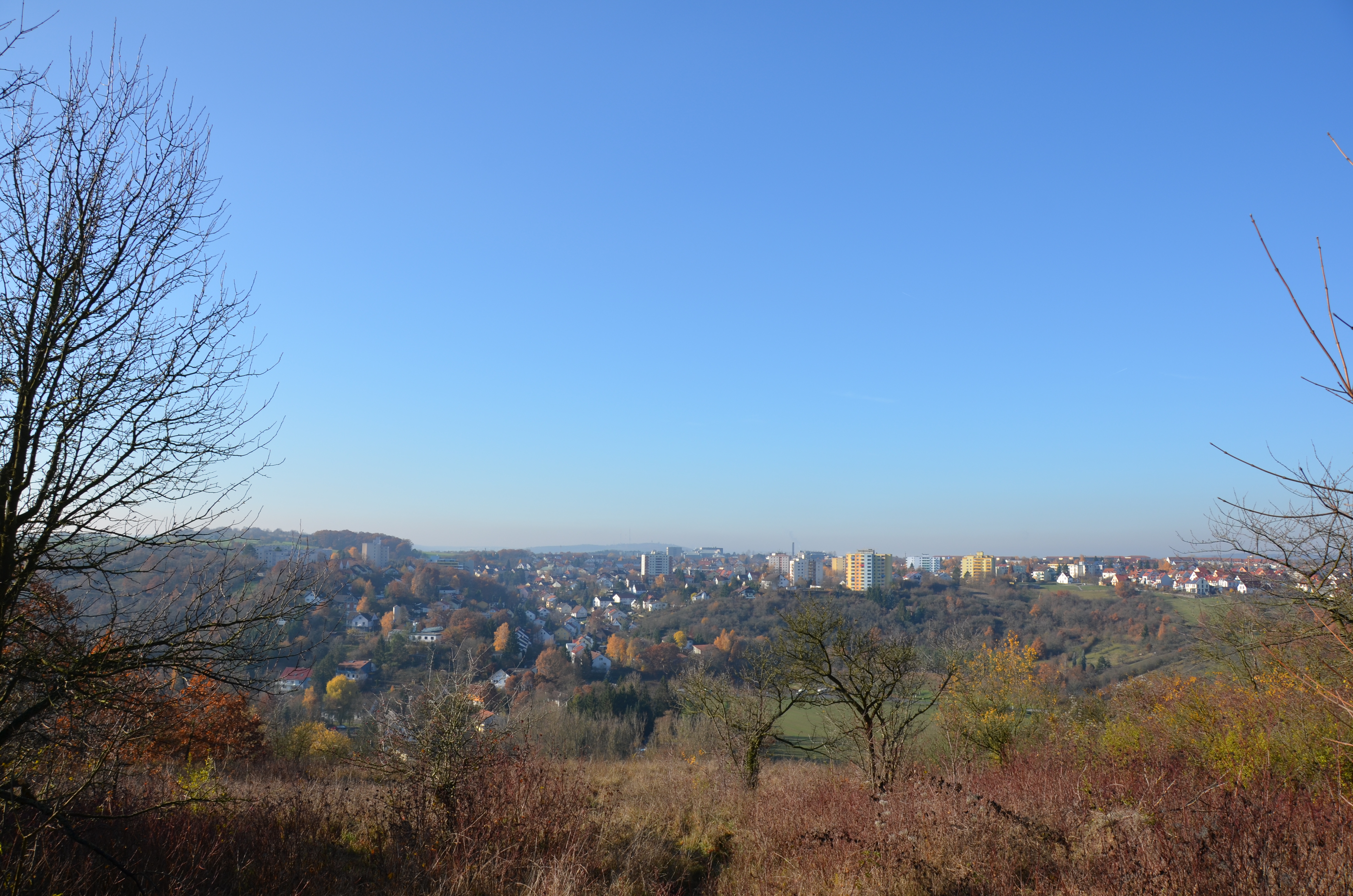 Deutsch: Blick vom Roßsteig aus auf das Gerbrunner Tal zwischen Happachberg und Zottenhügel. Der Verlauf der Hauptstraße, die sich das Tal entlang windet, lässt sich anhand der Häuser erahnen. Die röm.-kath. Kirche St. Nikolaus ist gut zu erkennen. Einige Gebäude der Julius-Maximilians-Universität Würzburg (Campus am Hubland) befinden sich in Bildmitte am hinteren Rand der erkennbaren bebauten Fläche. Im Hintergrund sind die Frankenwarte und die Funktürme auf dem Nikolausberg bei Würzburg zu sehen. English: View of the main valley of Gerbrunn between the Happachberg and the Zottenhügel. The course of the main road winding through the vally is hinted by the houses. The roman catholic church St. Nikolaus is clearly visible. Some of the Julius-Maximilians-Universität Würzburg's buildings (Hubland campus) can be made out in the center of the Picture at the end of the build-up area. In the background one can see the Frankenwarte and the radio towers on the Nikolausberg near Wuerzburg. |