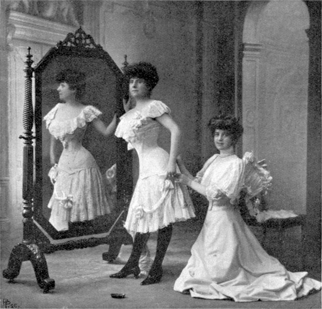 Français : Un coup d'œil indiscret chez; Germaine DELAGE; 9, rue de la Paix, 9 nous permet de contempler les lignes gracieuses de Mlle Marcelle Bordo, du théâtre des Capucines, très élégamment moulée par la jeune corsetière en vogue qui lui essaie elle-même. English: An indiscreet glance at Germaine Delage (9, rue de la Paix, 9) allows us to contemplate the graceful lines of Madamoiselle Marcelle Bordo, of the Capucines Theater, very elegantly fitted by the fashionable young corsetiere herself. |