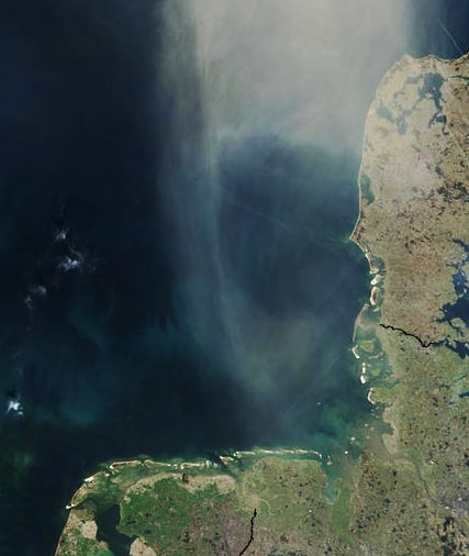 Satellite view of the German Bight. Rotated section of Image:NASA_NorthSea1.jpg with enhanced contrast.