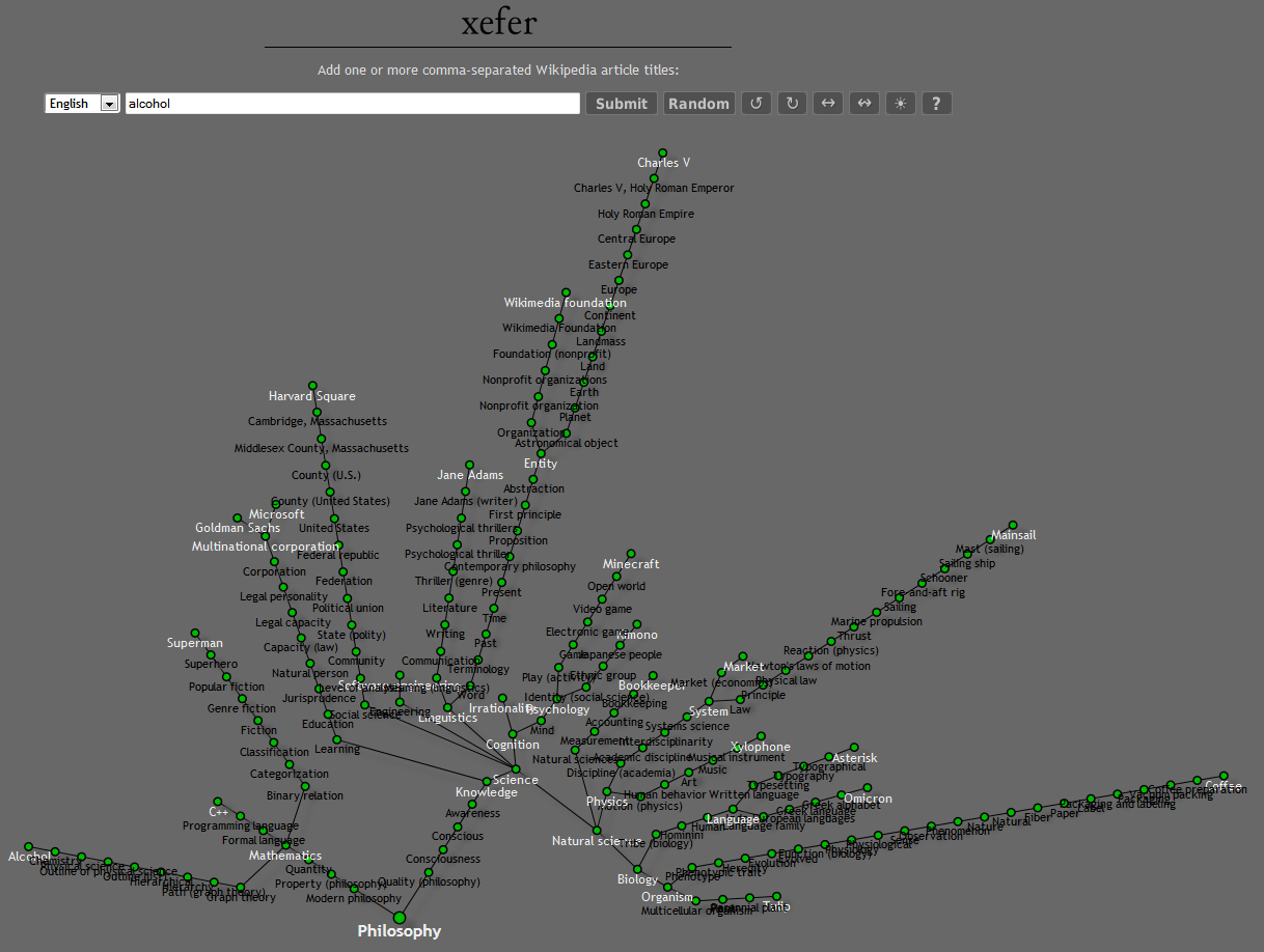 Français : Graphe généré à partir du premier lien des articles de Wikipédia, excluant les liens en italique ou entre parenthèses (afin d’éviter les boucles triviales comme les pages d’homonymes). Voir https://fr.wikipedia.org/wiki/Wikipédia:Se rendre à l'article philosophie. |