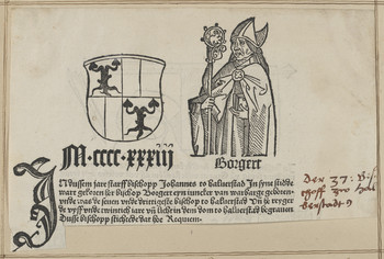 Deutsch: Burchard III. von Warberg, Bischof von Halberstadt (Holzschnitt von 1492, Teil von: Bote, Conrad, Cronecken der Sassen, Buch, 1492, Mainz) |