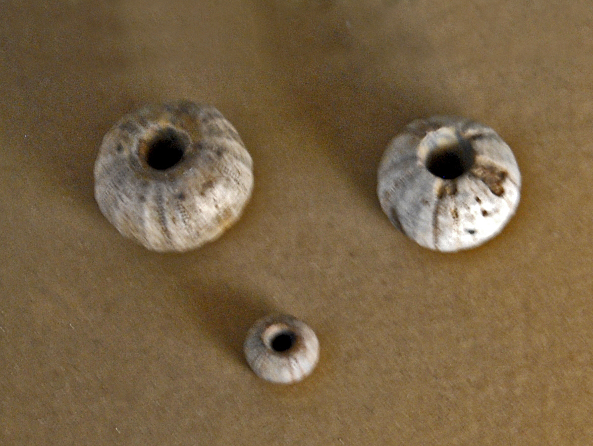 English: Echinopsis from Sudan, perforated specimen to be threaded. On display at Gallery of Paleontology and Comparative Anatomy, Paris. |
