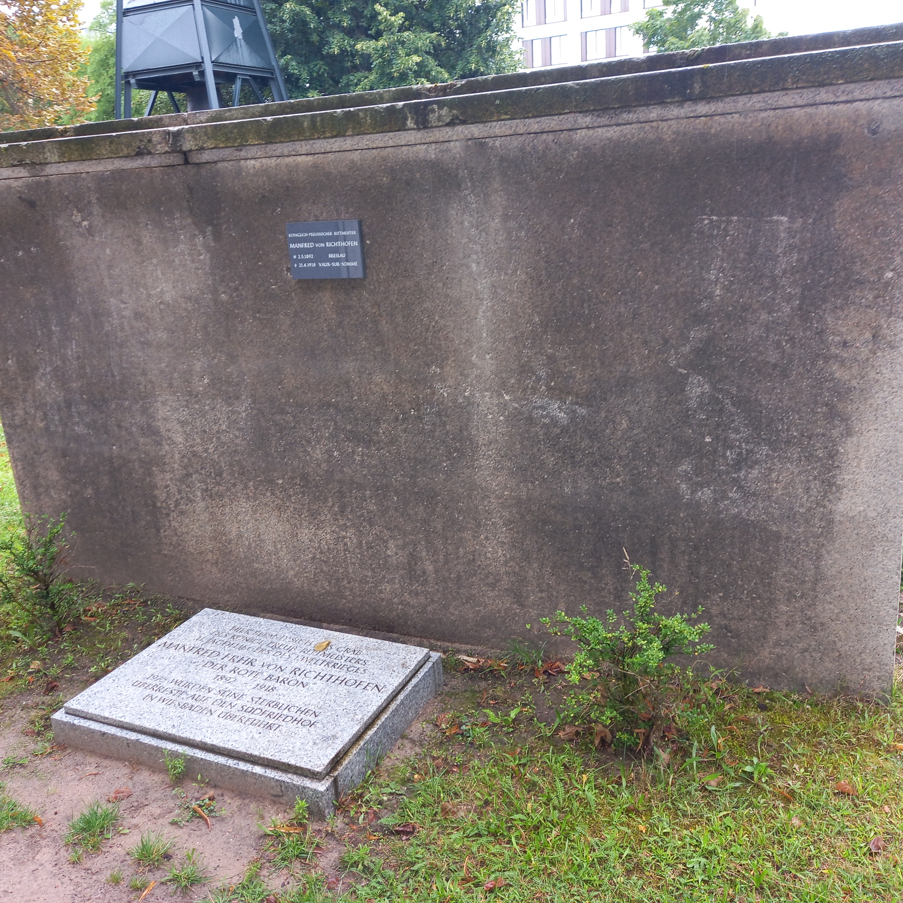 Deutsch: Rückseite des Grabsteins am ehemaligen Grab des deutschen Offiziers und Jagdfliegers Manfred von Richthofen auf dem Invalidenfriedhof in Berlin.