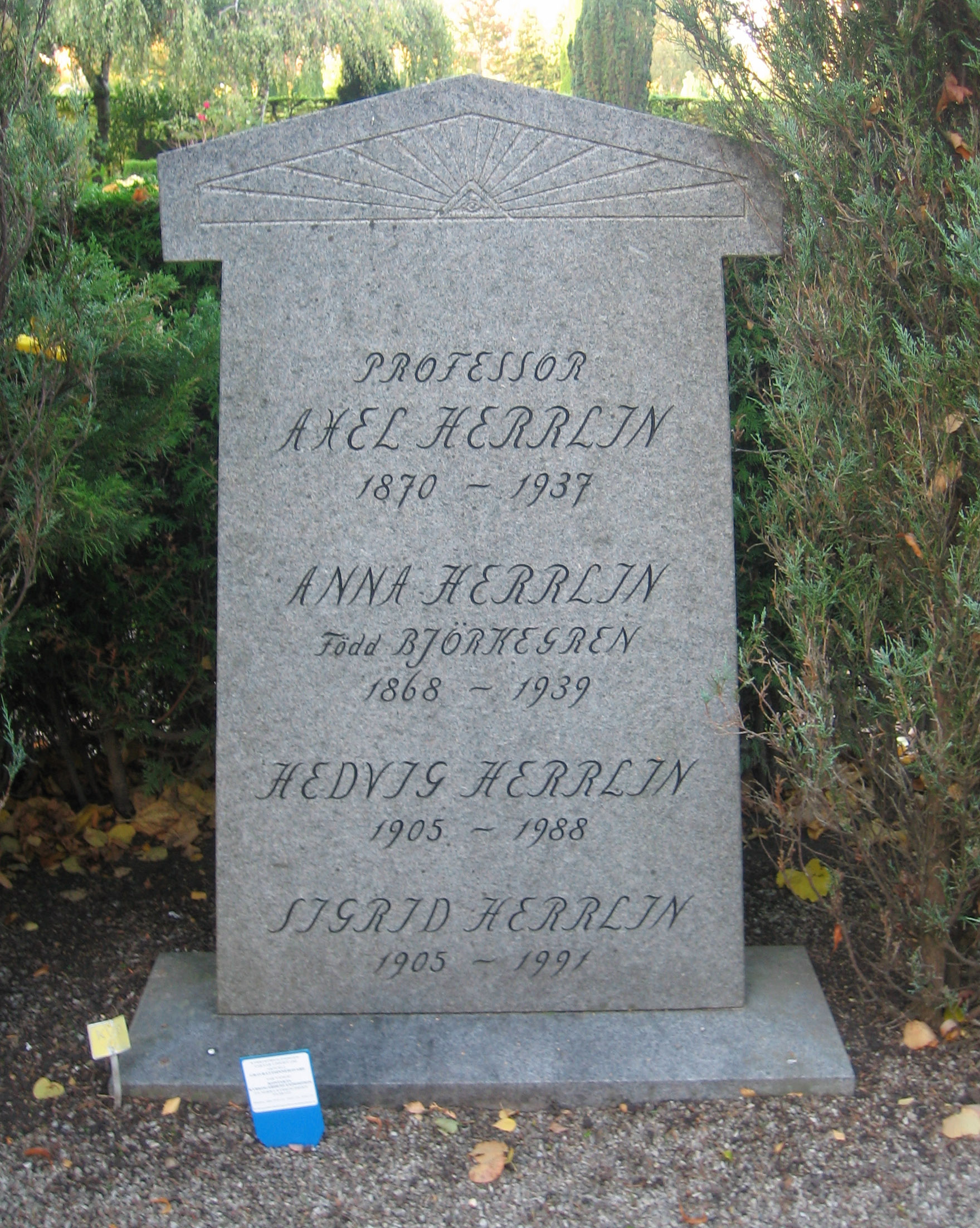 English: Grave of swedish professor Axel Herrlin (1870-1937). Photo taken at Norra kyrkogården, Lund, Sweden, 081007 by the uploader.