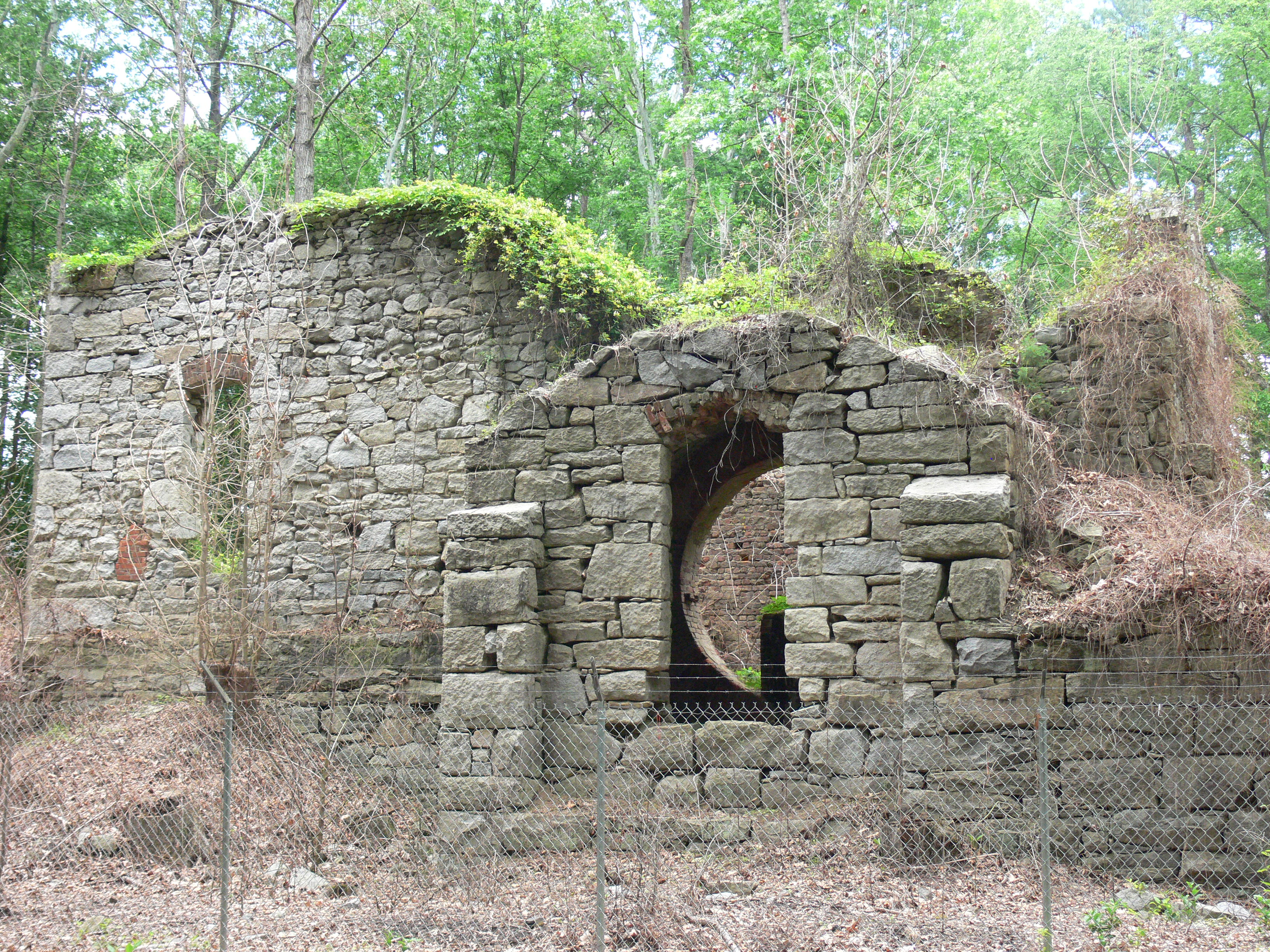 English: The ruins of the Grove Shaft from the Midlothian coal mines; Mid-Lothian Mines Park, Midlothian, Virginia. |
