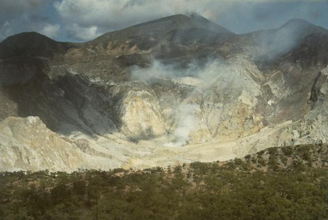 English: The steaming summit caldera of Gunung Sirung volcano is seen here from the eastern caldera rim. Sirung volcano lies at the NE end of a 14-km-long line of volcanic centers forming a peninsula at the southern end of Pantar Island. A lava dome (center) at the western side of the caldera forms the summit of Gunung Sirung volcano; other cones along the chain to the SE increase in height. The 2-km-wide summit caldera has been the source of small phreatic eruptions during the 20th century. |