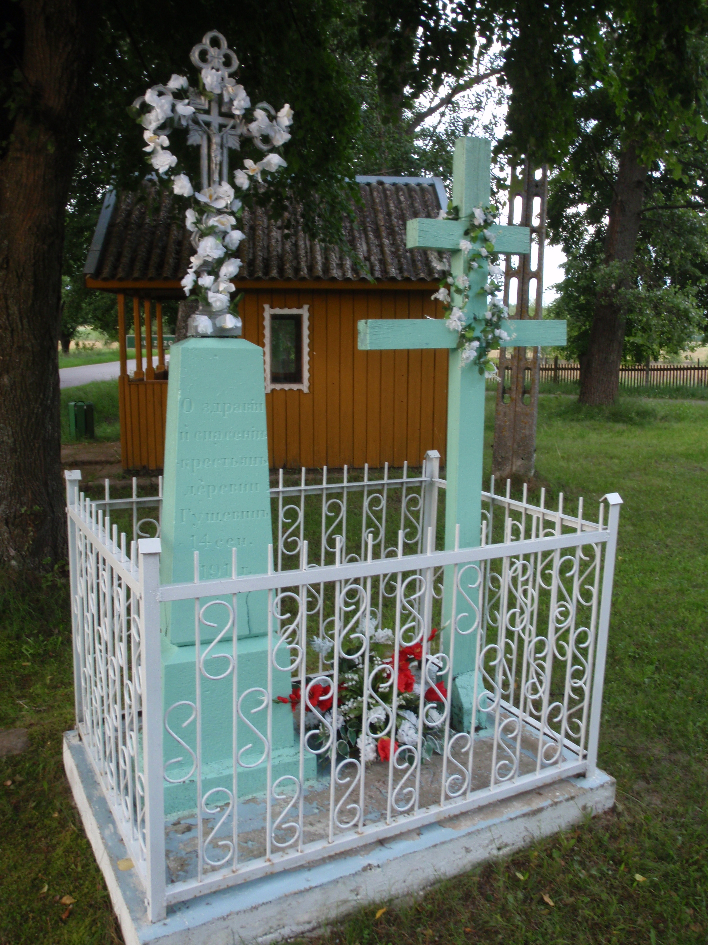 Polski: Przydrożna kapliczka z 1911 roku we wsi Guszczewina koło przystanku autobusowego, na końcu wjazdu od strony Olchówki