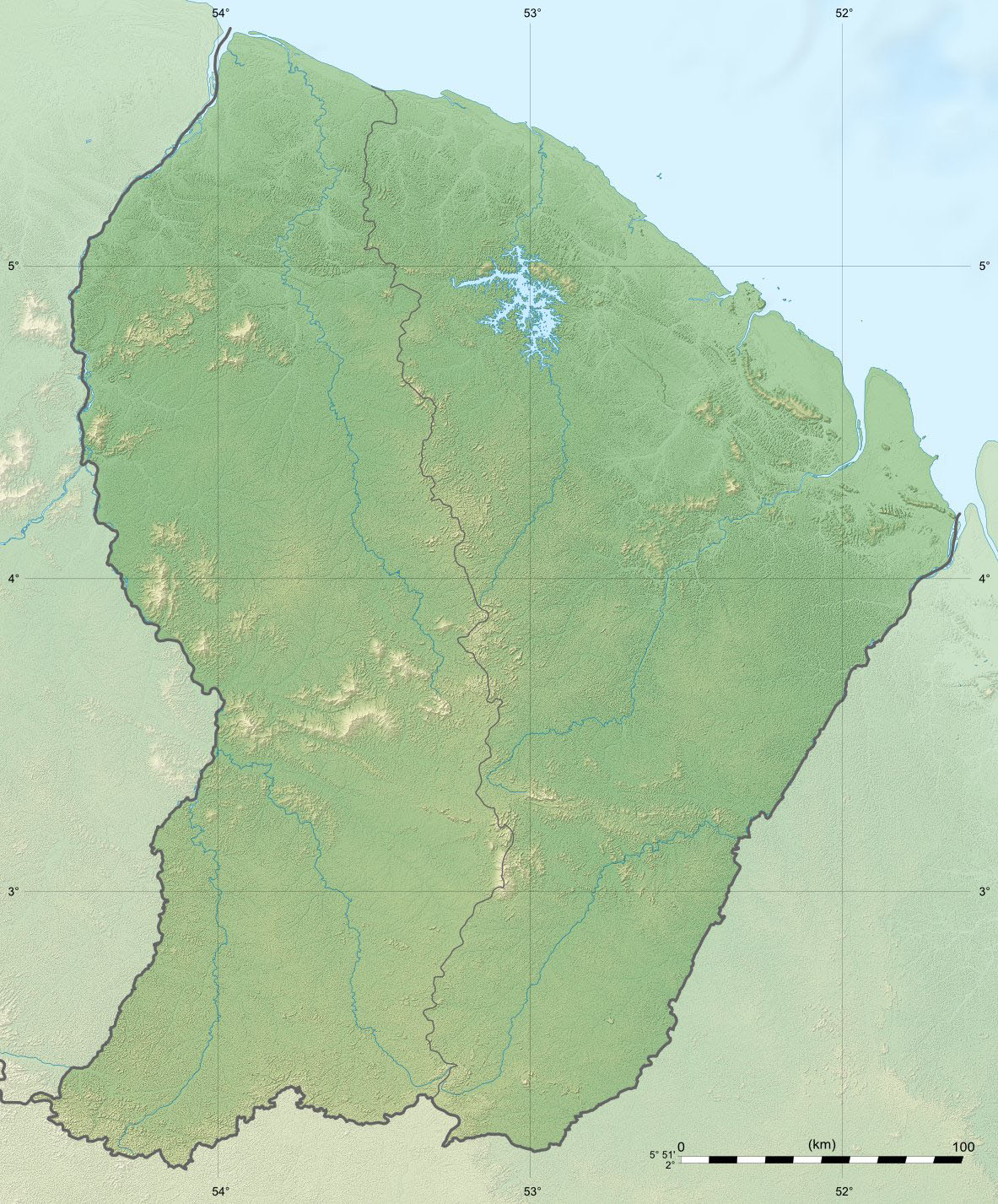 Français : Carte physique vierge de la région et département de Guyane, France, destinée à la géolocalisation, avec limite des arrondissements. Scales: 1:1,200,000 (precision: 300 m) for the topography; 1:7,444,000 (precision: 1,861 m) for the bathymetry