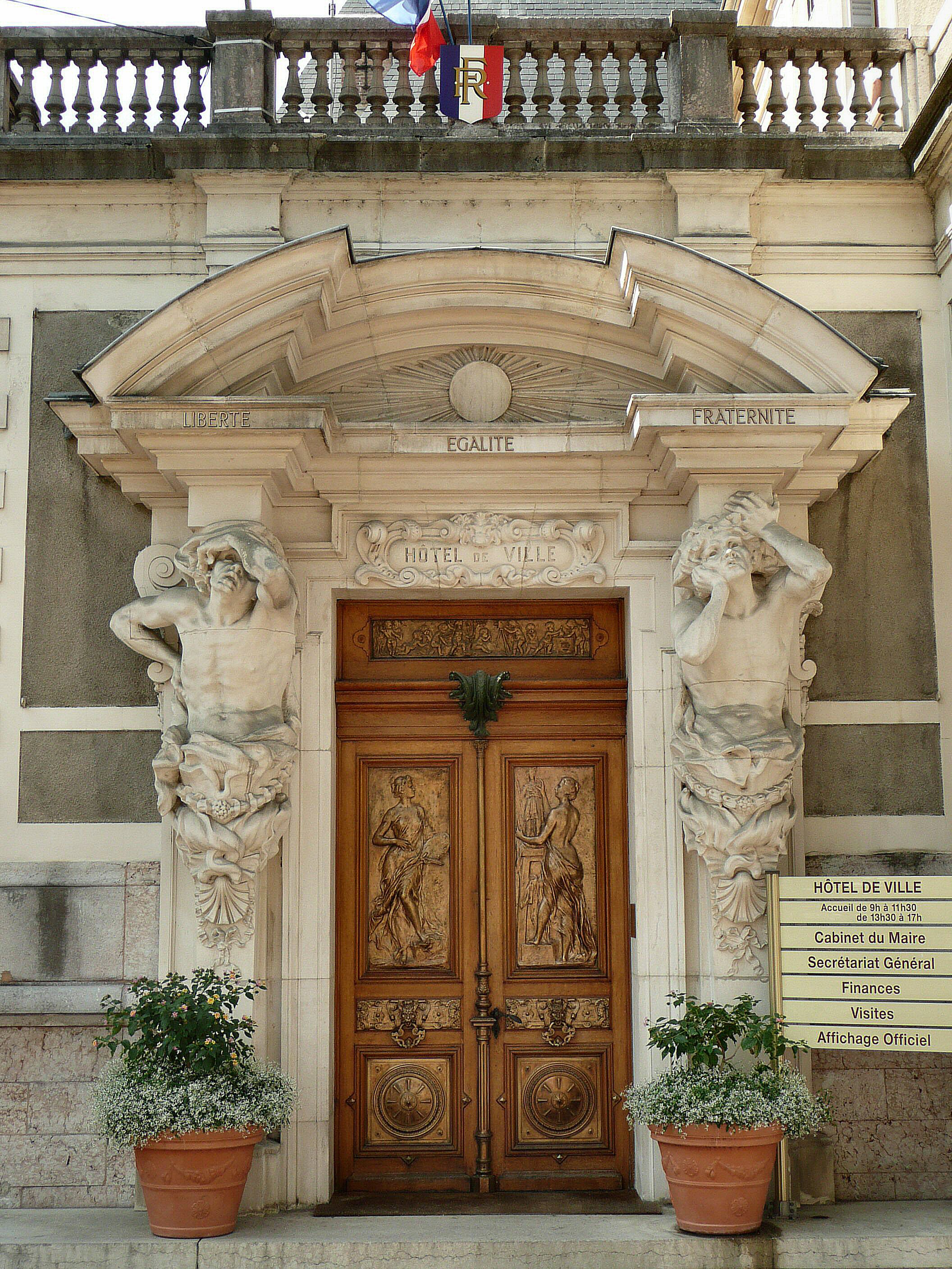 English: East entrance of Évian-les-Bains city hall. Caryatids on both sides are inspired by those of Pierre Puget sculpted for Toulon city hall.