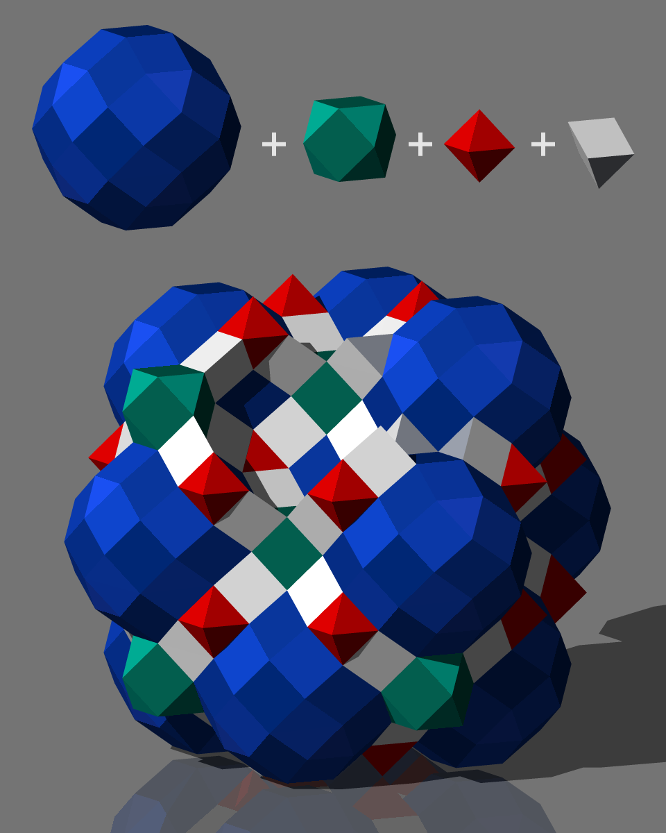 Deutsch: Raumfüllung mit ausgedehnten Rhombendodekaeder, Kuboktaeder, Oktaeder und dreieckigen Prismen