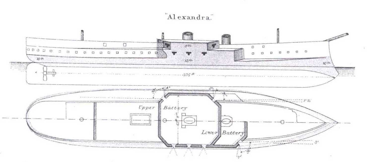 English: Line drawing and plan of HMS Alexandra, commissioned in 1877. |