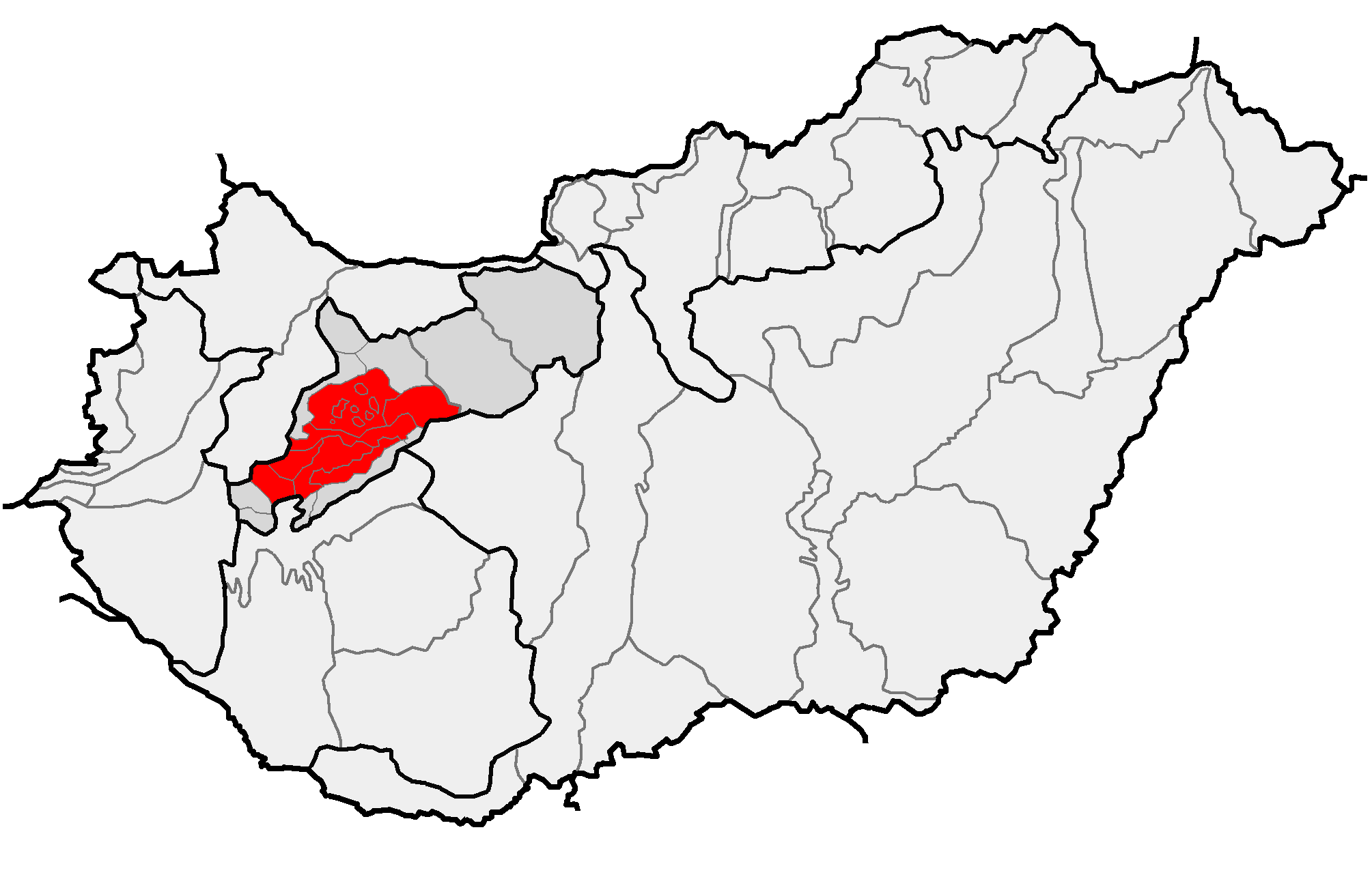 English: Location of hu:Bakony (red) and macroregion of hu:Dunántúli-középhegység (gray) within subdivisions of Hungary. |