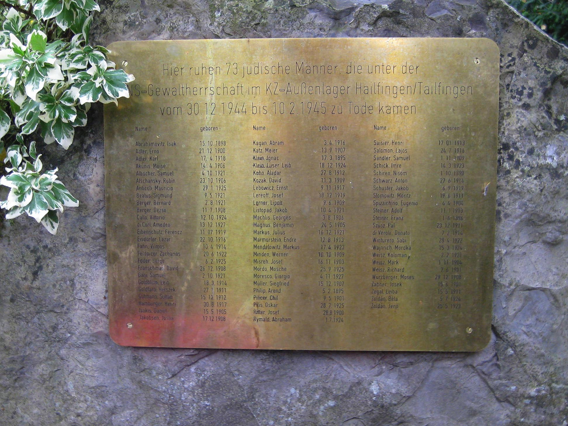 Deutsch: Gedenktafel mit den Namen aller beigesetzten Juden, 2010, auf dem Tailfinger Friedhof - Deutschland, Baden-Württemberg, Gäufelden |