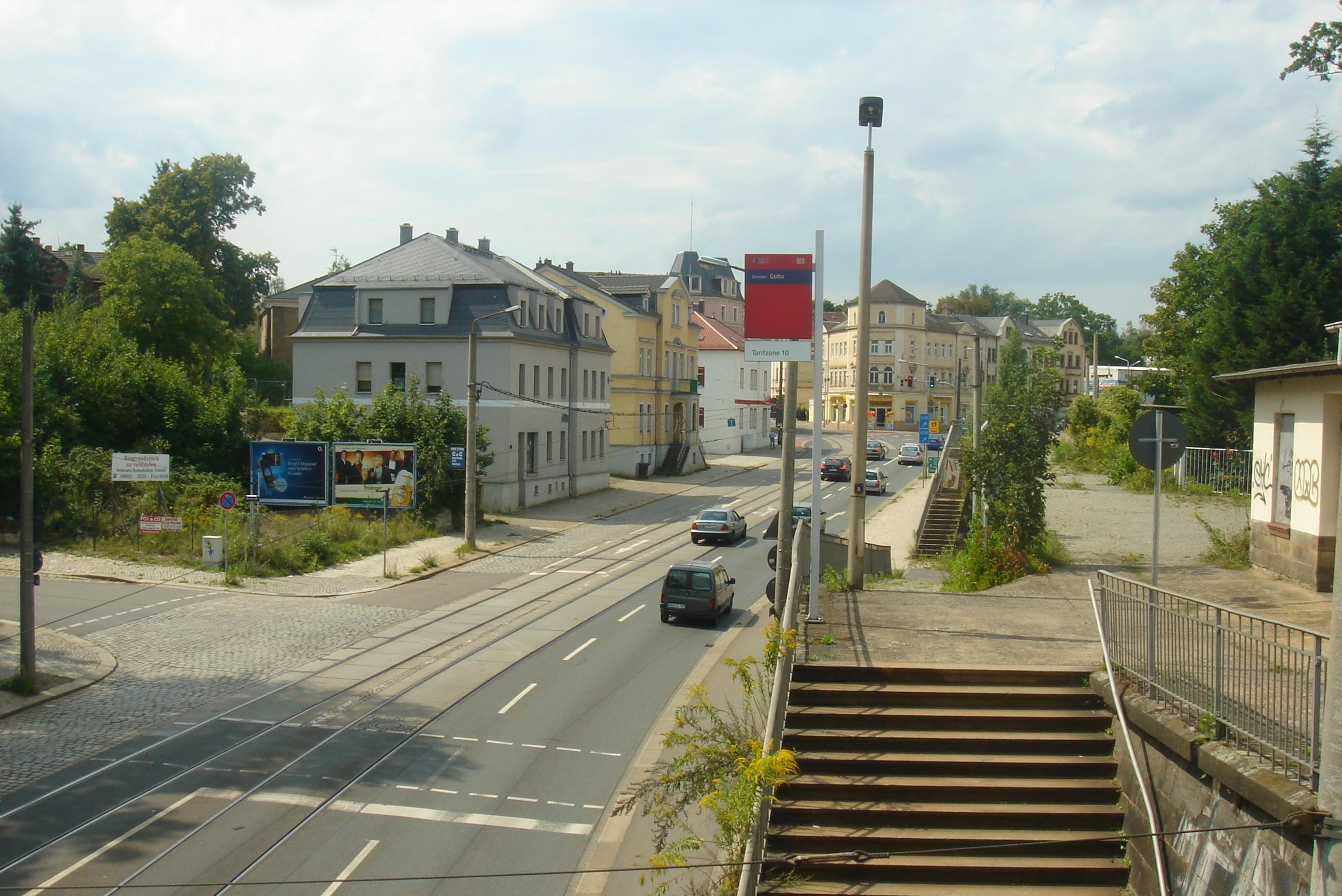 Deutsch: Blick vom Haltepunkt Dresden-Cotta an der Bahnstrecke Berlin-Dresden auf die Hamburger Straße in Richtung Warthaer Straße |
