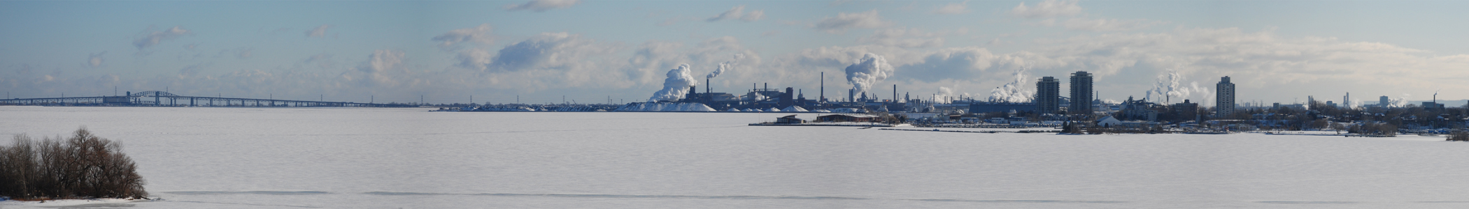 English: A panoramic view of Hamilton, Ontario, Canada, seen from the York Street Bridge. In -30 degrees Celsius, the pollution from the steel industry on the Hamilton waterfront is clearly visible. |