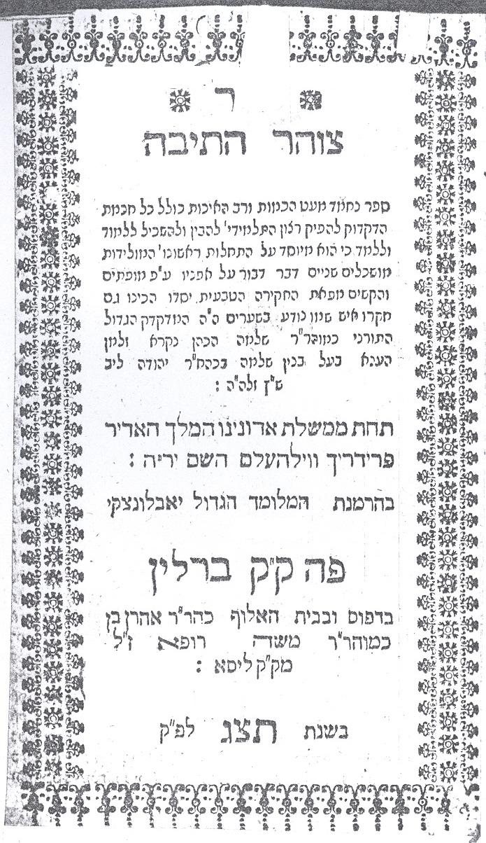 Front page of "Zohar HaTeva", Hebrew grammar book by Solomon Hanau, printed Berlin 1733. Scanned by User:Netan'el