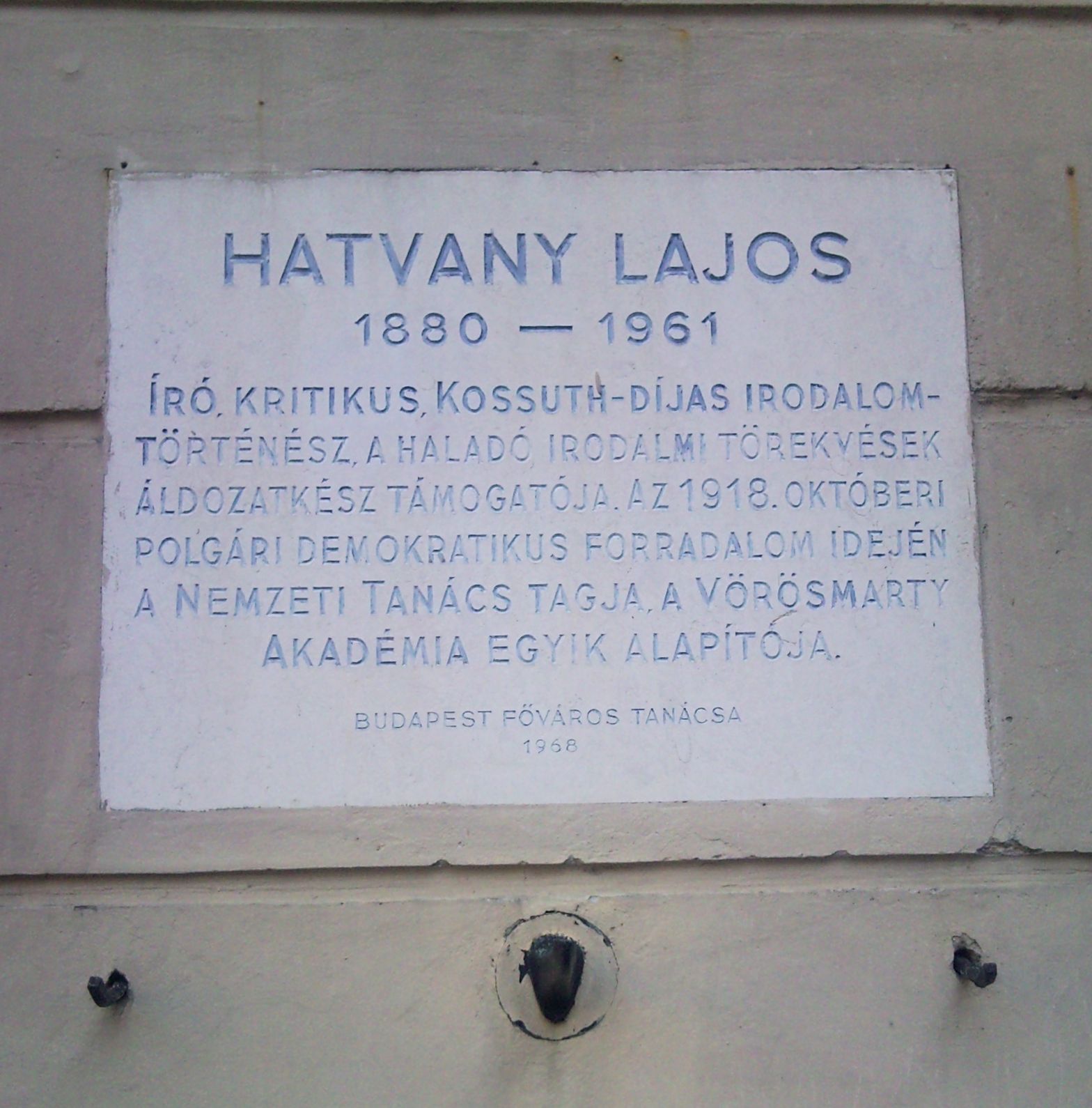 (مجرية) English: Lajos Hatvany commemorative plaque in Budapest District I, Országház Street No 19 (Kard Street side) |