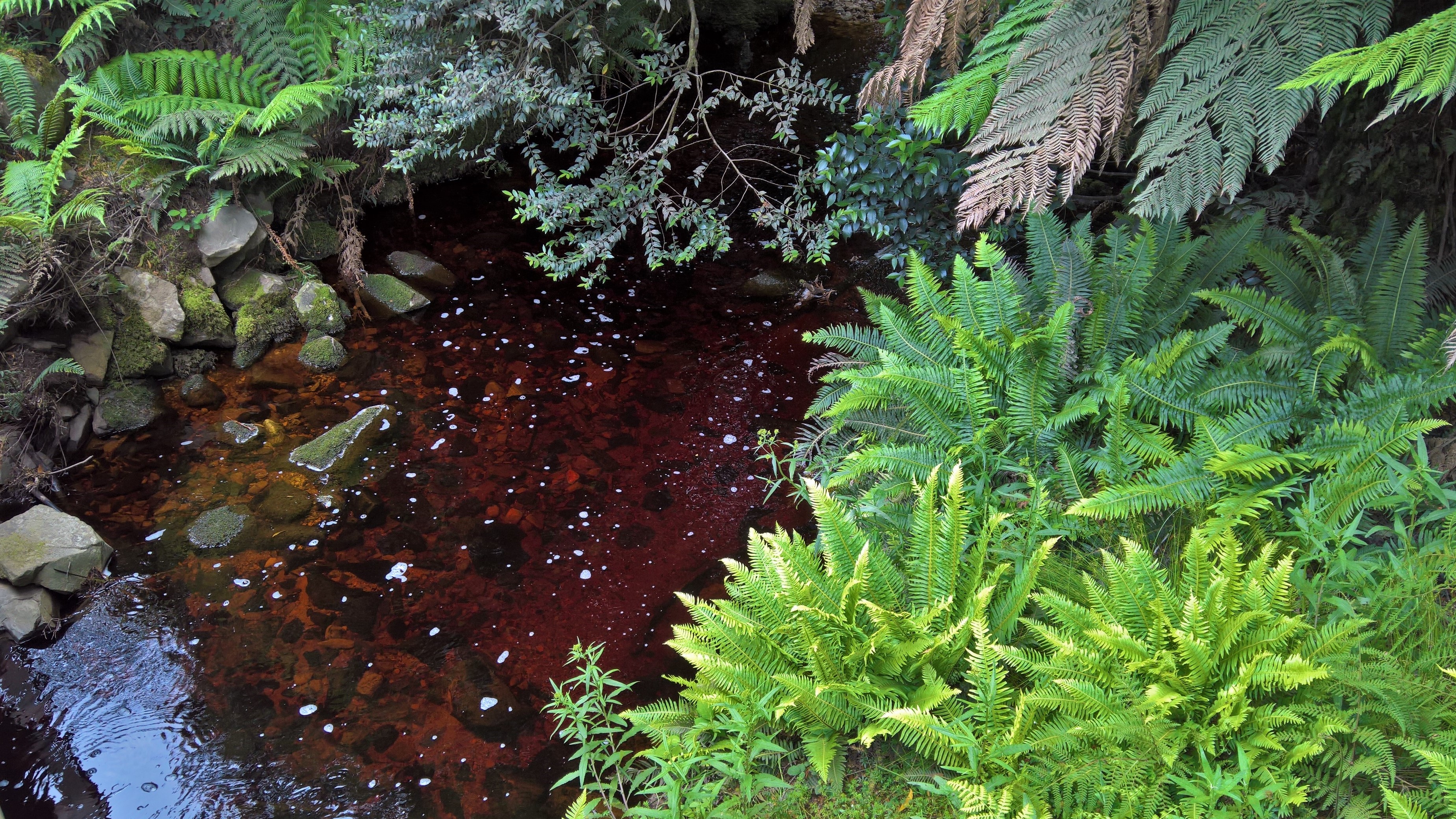 English: The tannin-rich stream produces a deep red/brown colour, taken from the edge of a small bridge. The weather at the time was overcast - on a sunny day, the red hue appears less intense. |