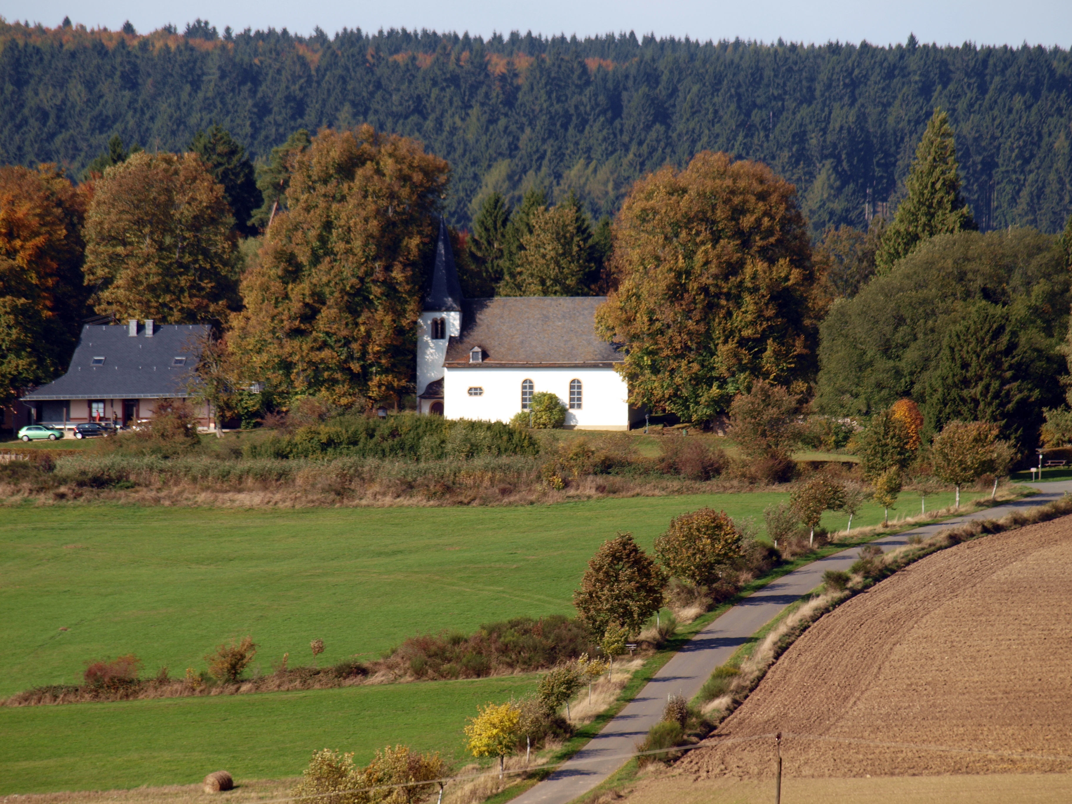 Deutsch: Evangelische Pfarrkirche Heiligenbösch - Heiligenbösch bezeichnet die westlich von Leisel an einem Waldrand stehende evangelische Pfarrkirche Heiligenbösch mit anschließenden Friedhof und dem Freizeitheim Heiligenbösch. |
