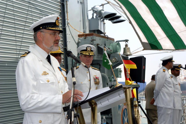 Description German Rear Adm. Heinrich Lange, incoming commander of Combined Task Force 150, speaks during a change of command ceremony aboard Pakistani naval ship PNS Shahjahan (D 186) as the outgoing commander, Pakistani Rear Adm. Shahid Iqbal, middle, and U.S. Navy Vice Adm. Patrick Walsh, the Combined Forces Maritime Component Commander, look on in Mina Salman, Bahrain, Aug. 22, 2006. (Released) (Released to Public)