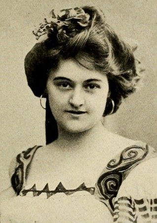 English: Helen Bertram, from a 1901 publication. A young white woman with dark hair in a bouffant updo, wearing hoop earrings and a bodice with a square, embellished collar. |
