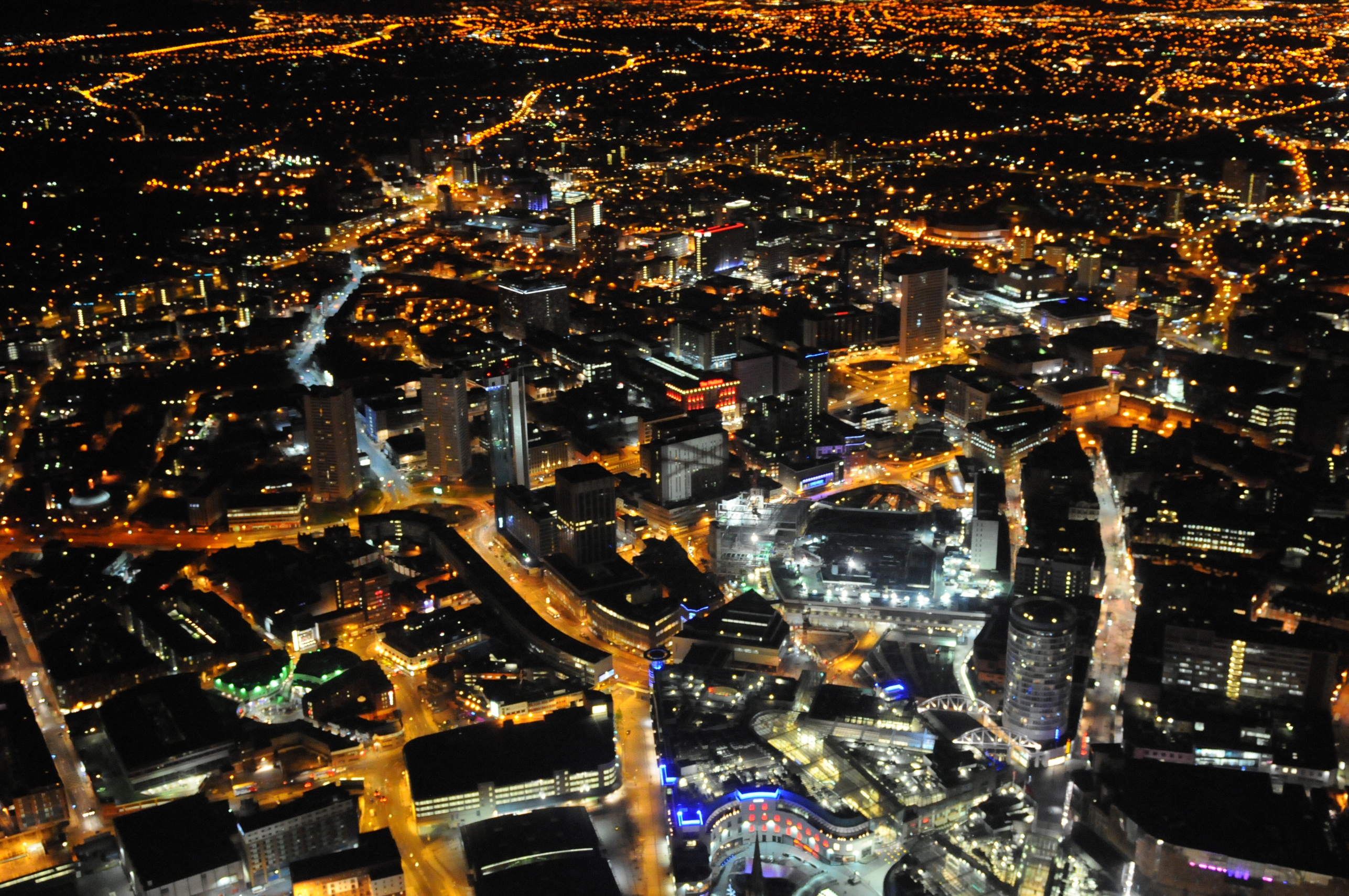| Description | Birmingham City Centre at night. The curve of the BullRing shopping centre is bottom-centre, framing the tip of the spire of St Martin's Church. To the right is the columnar Rotunda. The large white patch below-right of centre is New Street Station. In the centre, lit in red, is the Mailbox. The view is approximately to the West. |