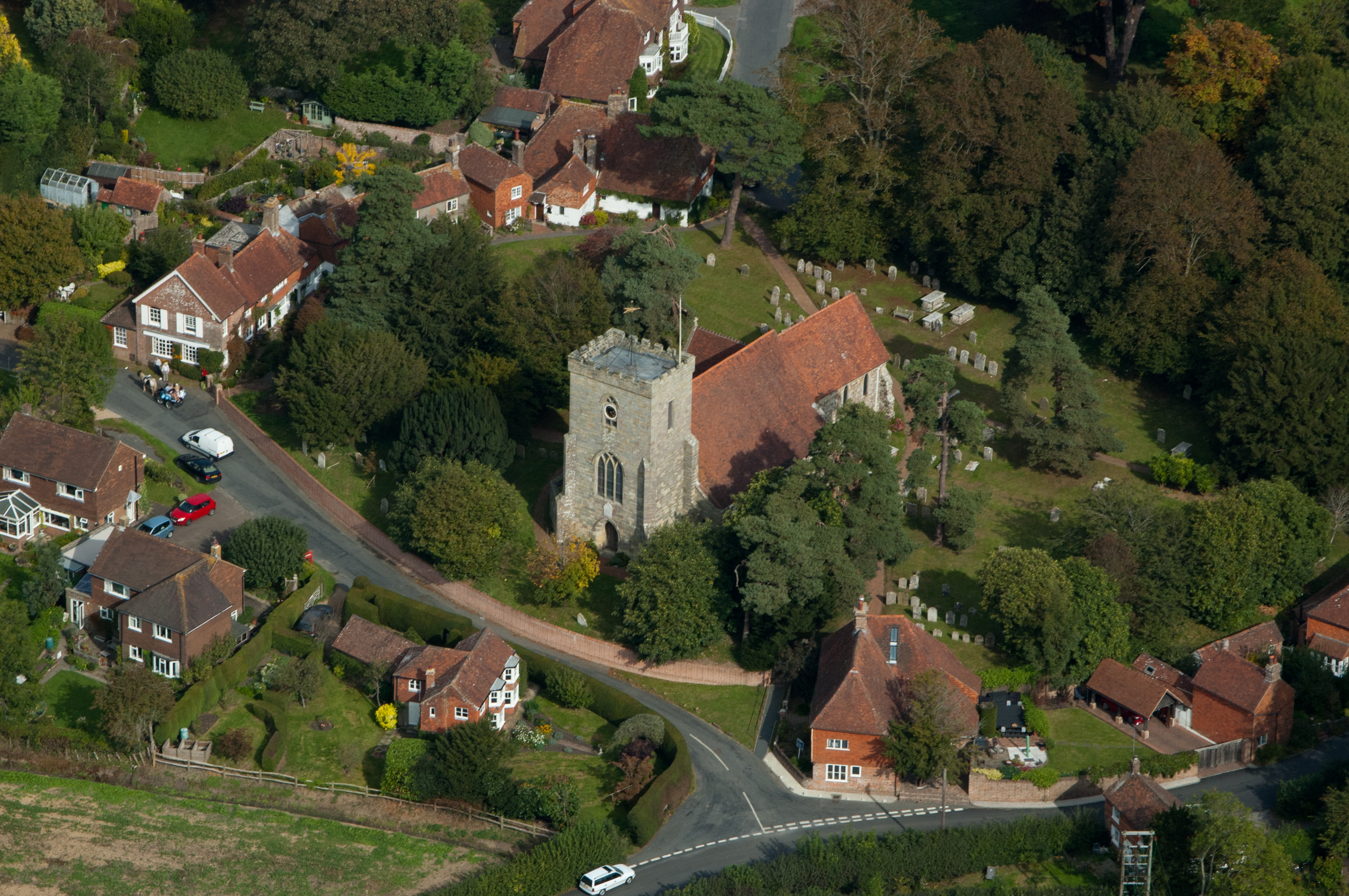 English: Aerial view of the Parish Church of St Peter and St Paul in Hellingly, East Sussex قالب:Listed building England |