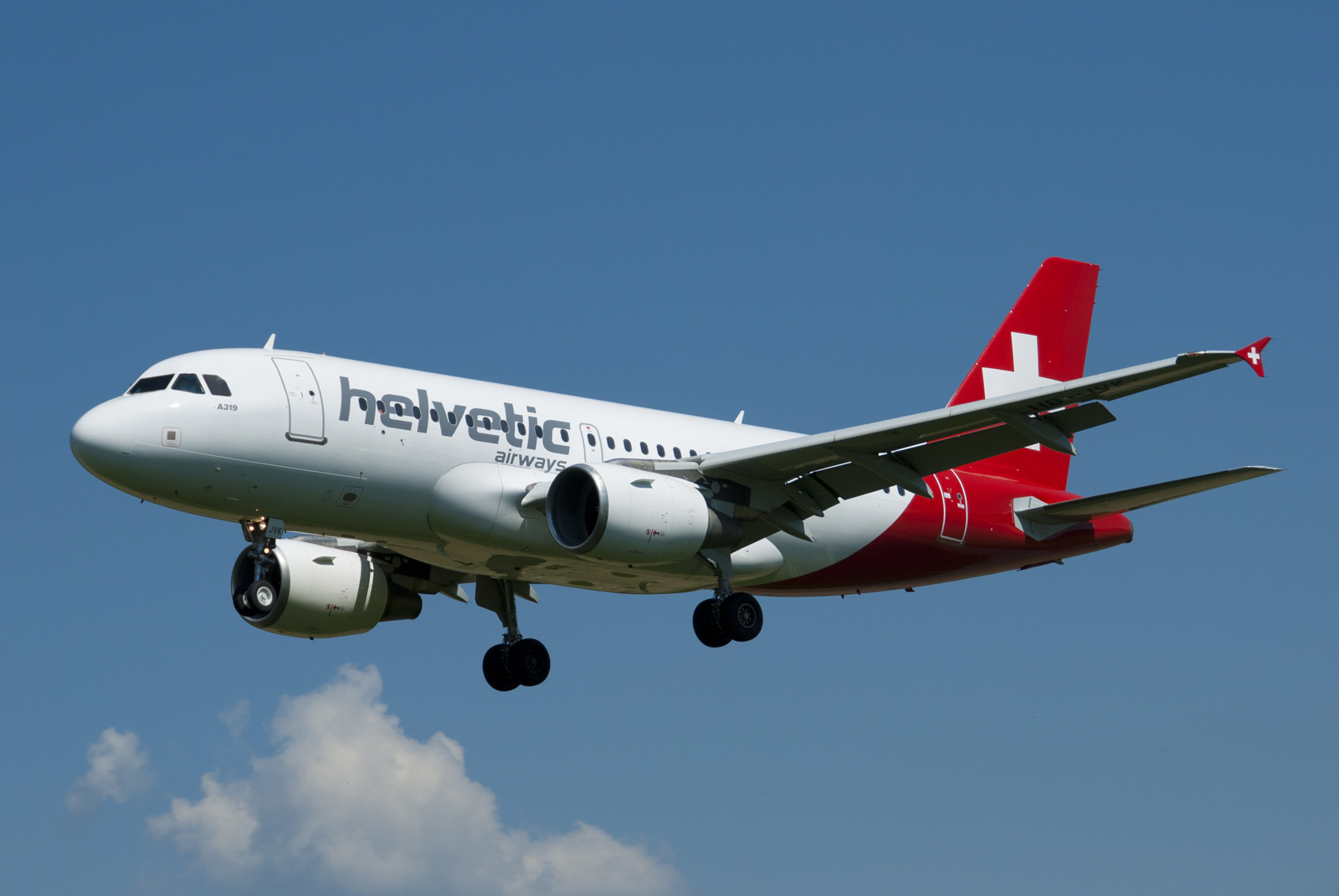 English: Airbus A319-112 HB-JVK of Helvetic Airways on short final for RWY 32 at Bern-Belp airport (LSZB). |