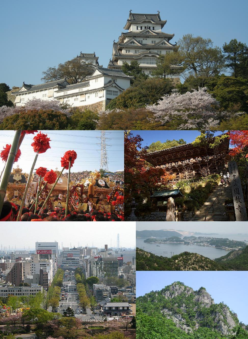 English: From top: Himeji Castle, Nada no Kenka Matsuri, Engyō-ji Temple, Central Himeji viewed from Himeji Castle, Ieshima Islands, Mount Seppiko.