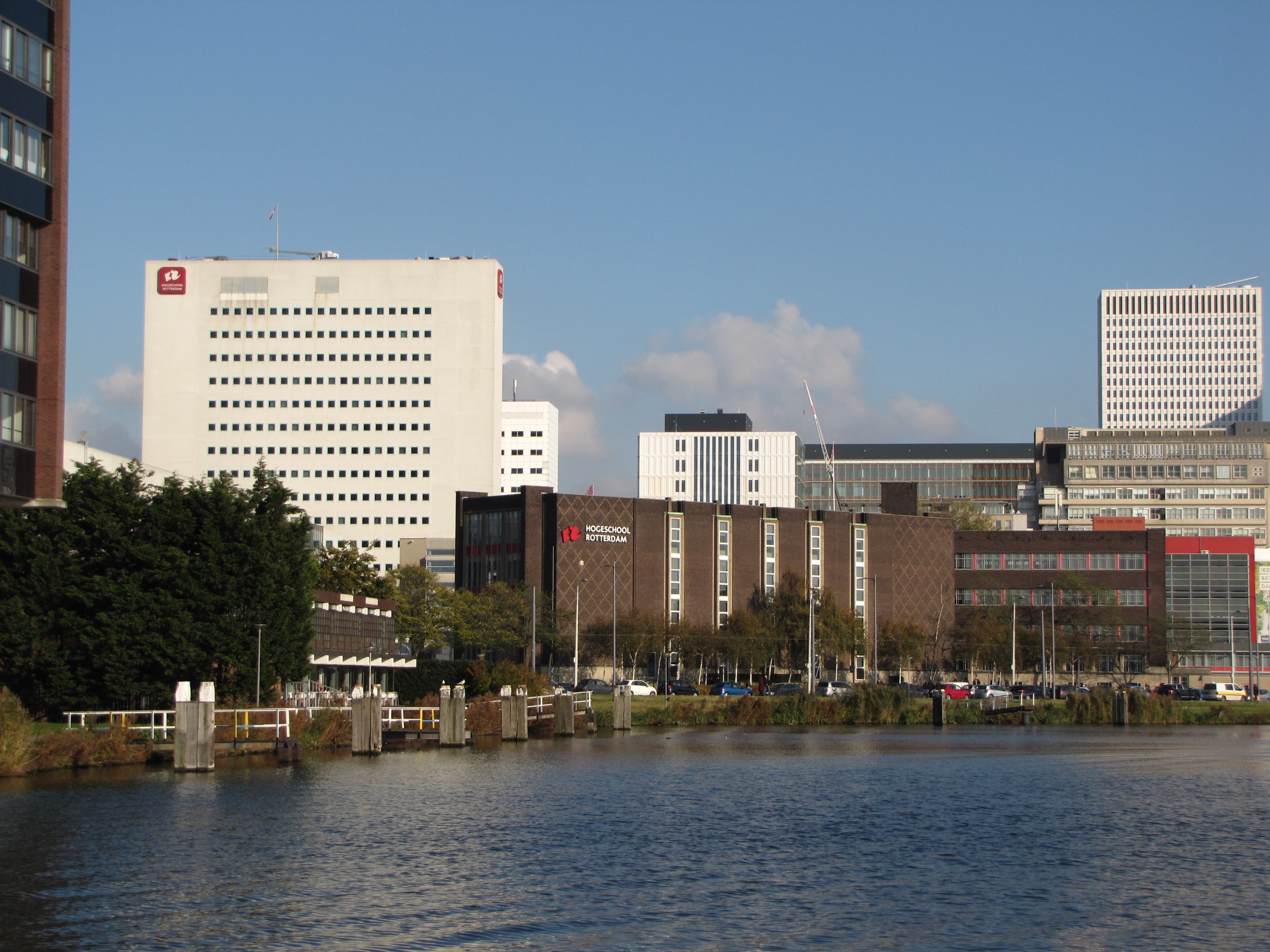 English: As seen from Coolhaven, two buildings of the Hogeschool Rotterdam, the Netherlands.