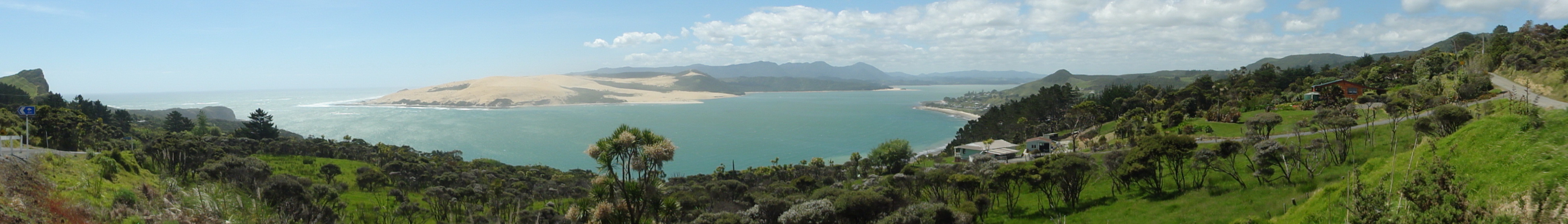 English: Panoramic of entrance to Hokianga Harbour, picture taken from view point at SH12/Wewton Road, Omapare |