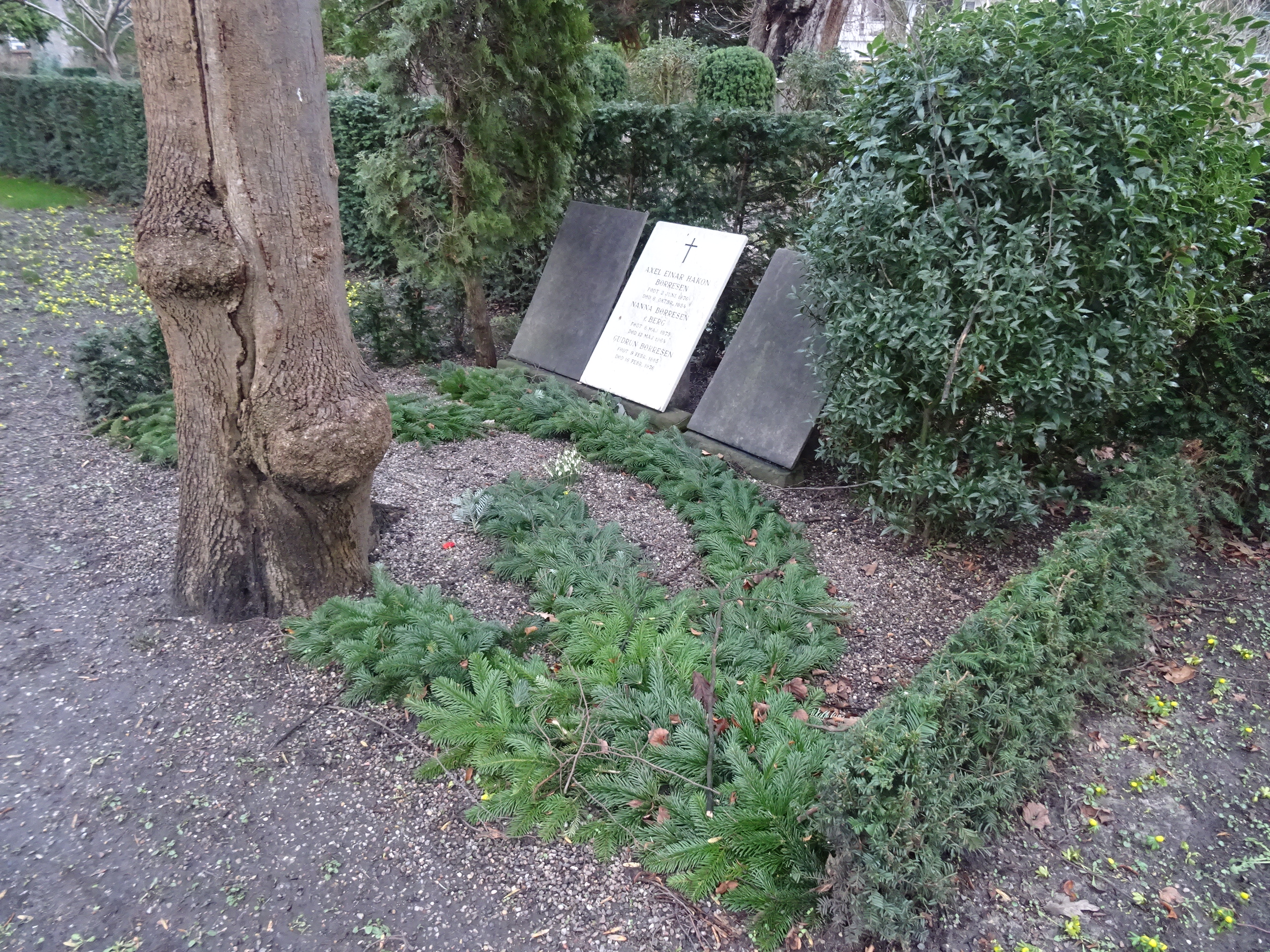 English: Grave of the composer Hakon Børresen (1876-1954) at Holmens Kirkegård in Østerbro in Copenhagen. The grave has been decorated with fir branches at Christmas.