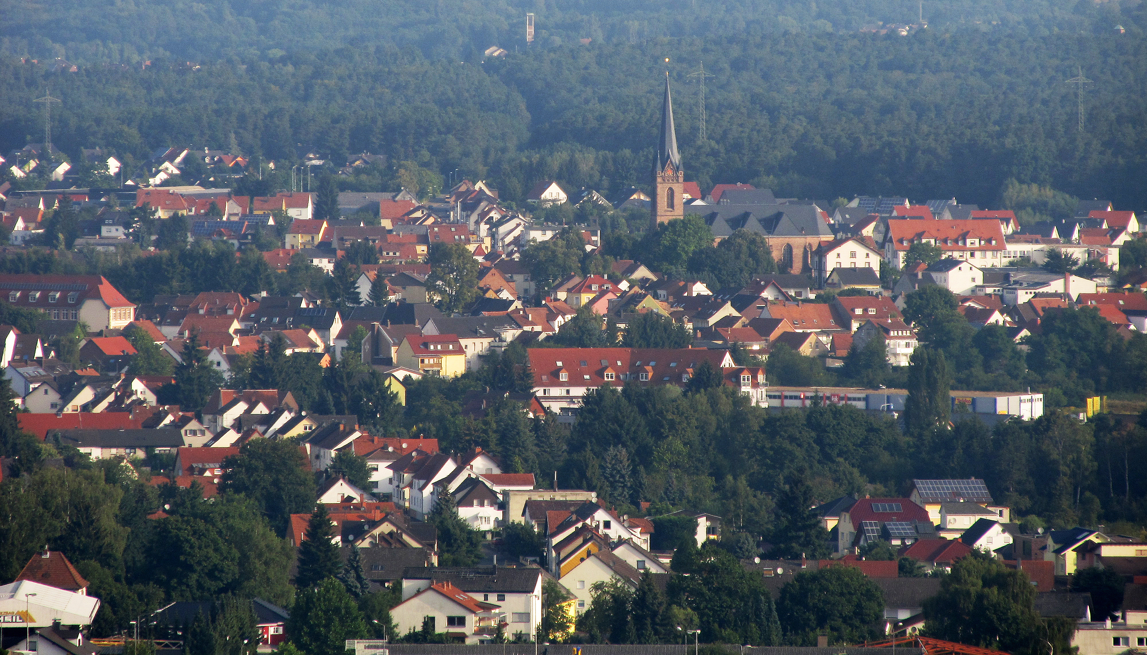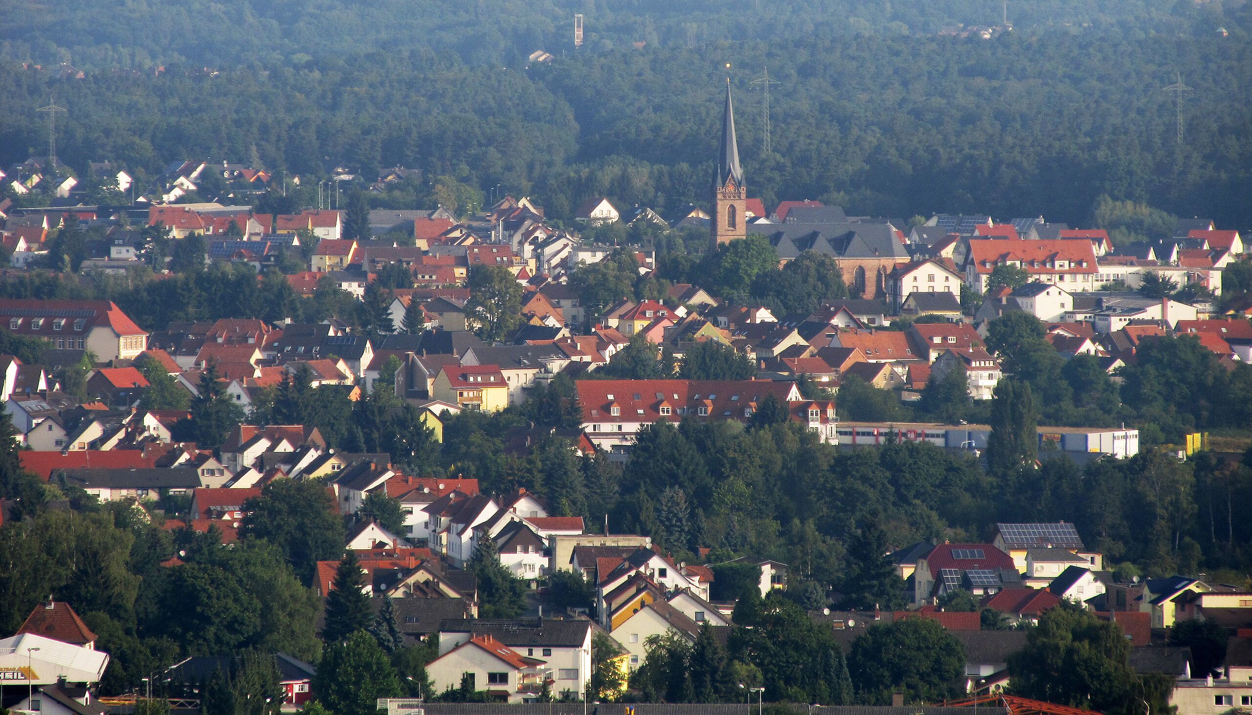 Deutsch: Blick vom Schlossberg in nordwestliche Richtung auf das Ortszentrum von Erbach, einem Stadtteil von Homburg, Saarland